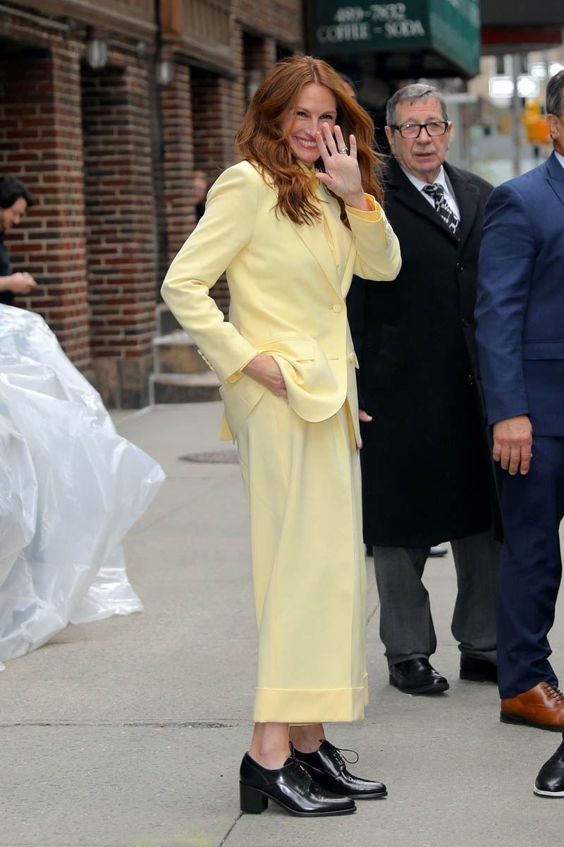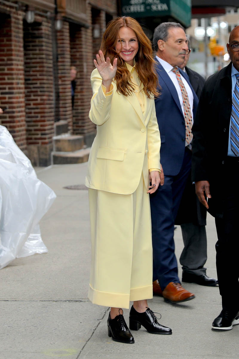 And here she is yesterday in New York in an excellent yellow suit by day and another excellent shorts suit with a waistcoat at the premiere by night. Is it giving you some nostalgia, this Julia style vibe? Let’s throw it back to the Golden Globes in 1990 – she’s been doing this a long time: