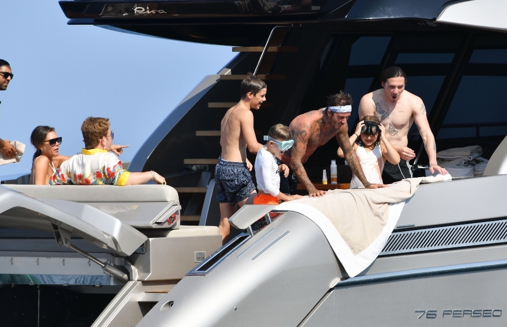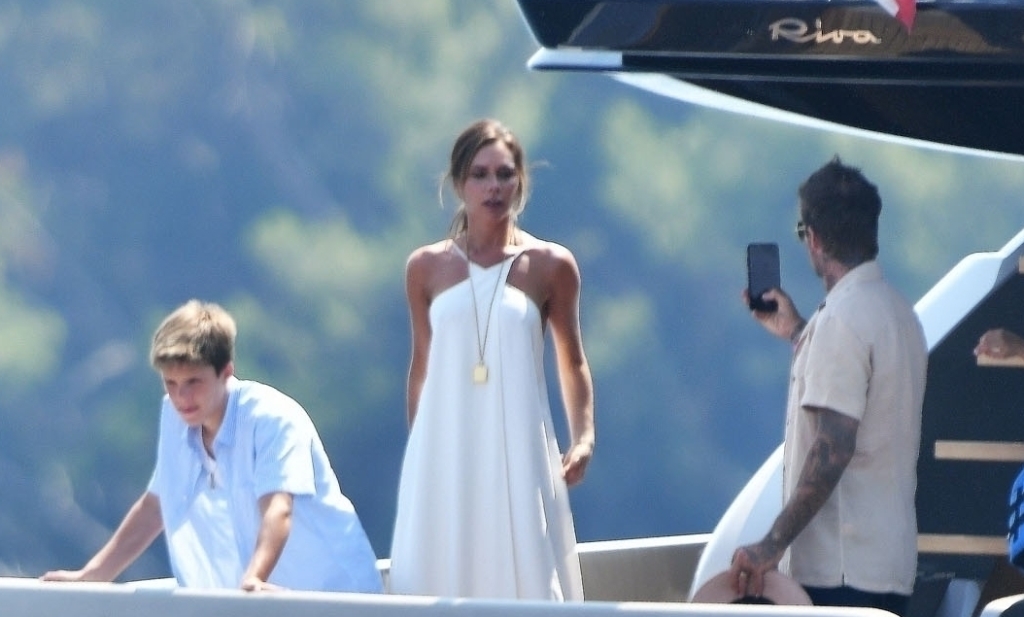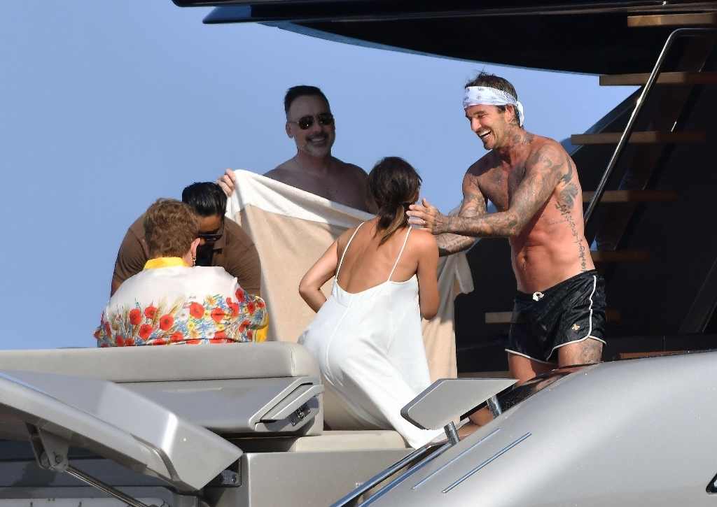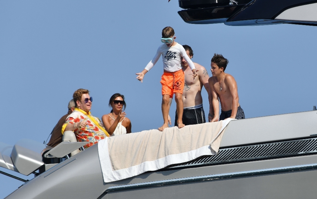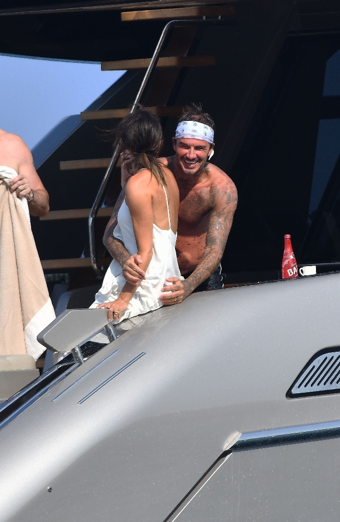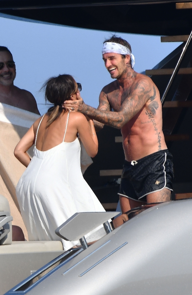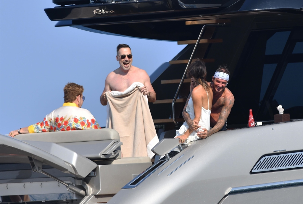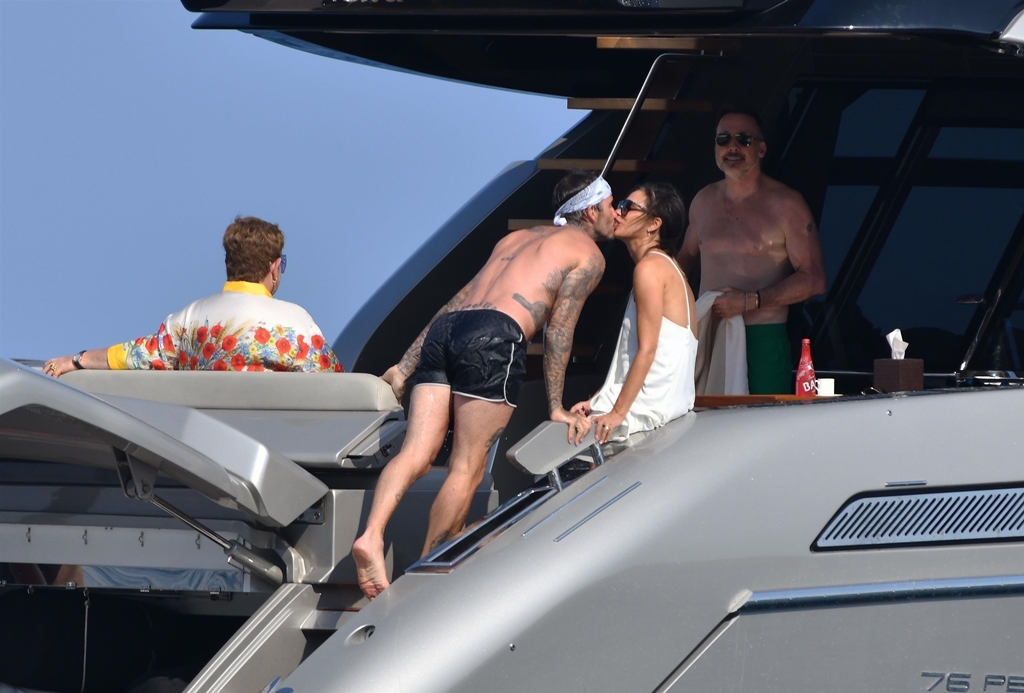 Anyway, the Beckhams didn’t break up. And they appear pretty solid in these pap shots on Elton’s boat. Check out David leaning into Victoria for a kiss. He has his arm around her in other pictures and they seem as close as they’ve ever been. The Beckhams have been married 20 years now. Their marriage is basically a celebrity institution. It has also been a celebrity institution to speculate about if they’re going to come apart. But not today, not today! (Maria can finish off her summer in peace.)