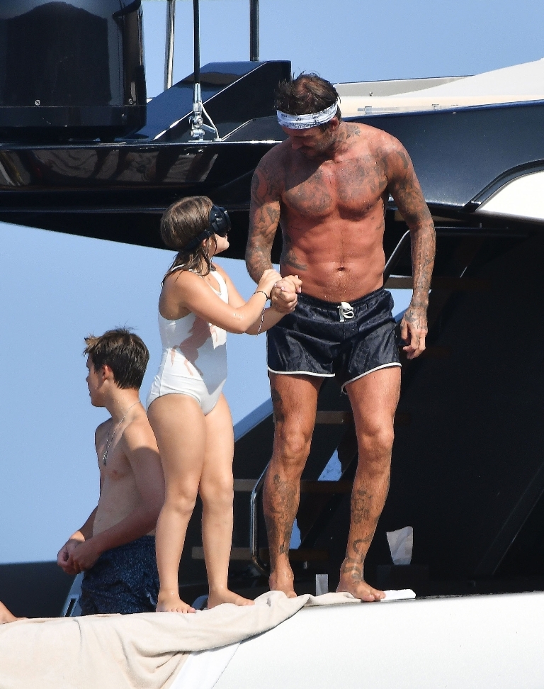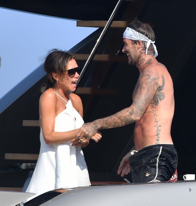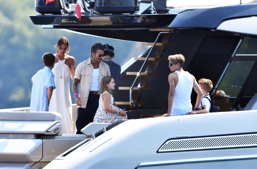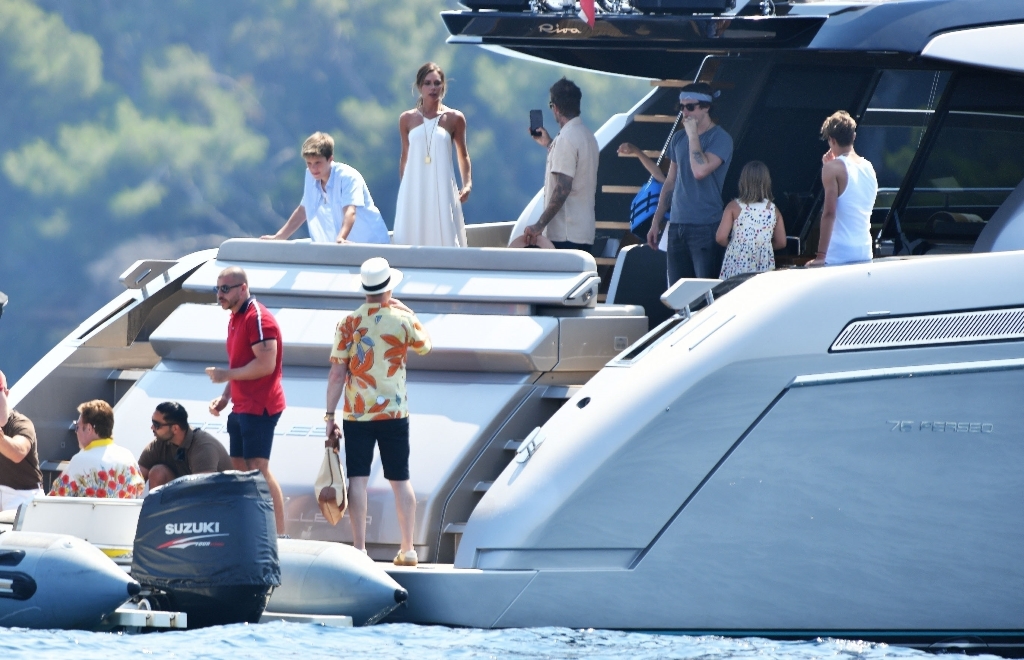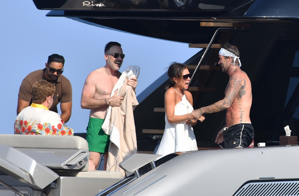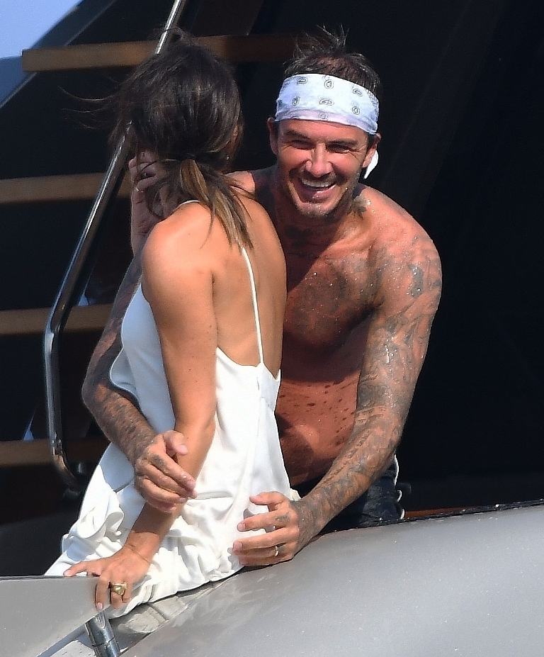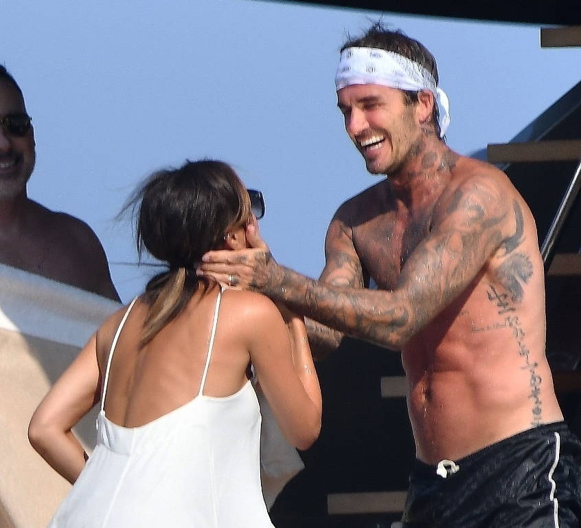Anyway, the Beckhams didn’t break up. And they appear pretty solid in these pap shots on Elton’s boat. Check out David leaning into Victoria for a kiss. He has his arm around her in other pictures and they seem as close as they’ve ever been. The Beckhams have been married 20 years now. Their marriage is basically a celebrity institution. It has also been a celebrity institution to speculate about if they’re going to come apart. But not today, not today! (Maria can finish off her summer in peace.)