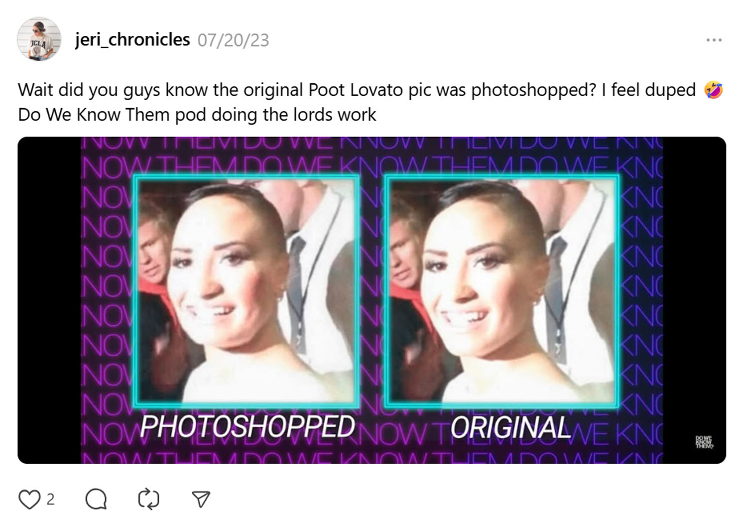 This wasn’t just a bad photo though, the edited version first came online with a story attached. Basically, a picture is worth a thousand words and in this case, you get the picture and the words = a pop culture moment. In this story, Poot Lovato was Demi’s long lost twin sister who she kept locked in a basement her whole life, with this event being the first time she saw the outside world, LOL. It’s been ten years and I still laugh literally every time I see it because it just reminds me of how weird the internet was in 2015, that a photo like that could even create such a movement, because that’s what it was and is. Poot even has her own Wikipedia page for f-ck sake!