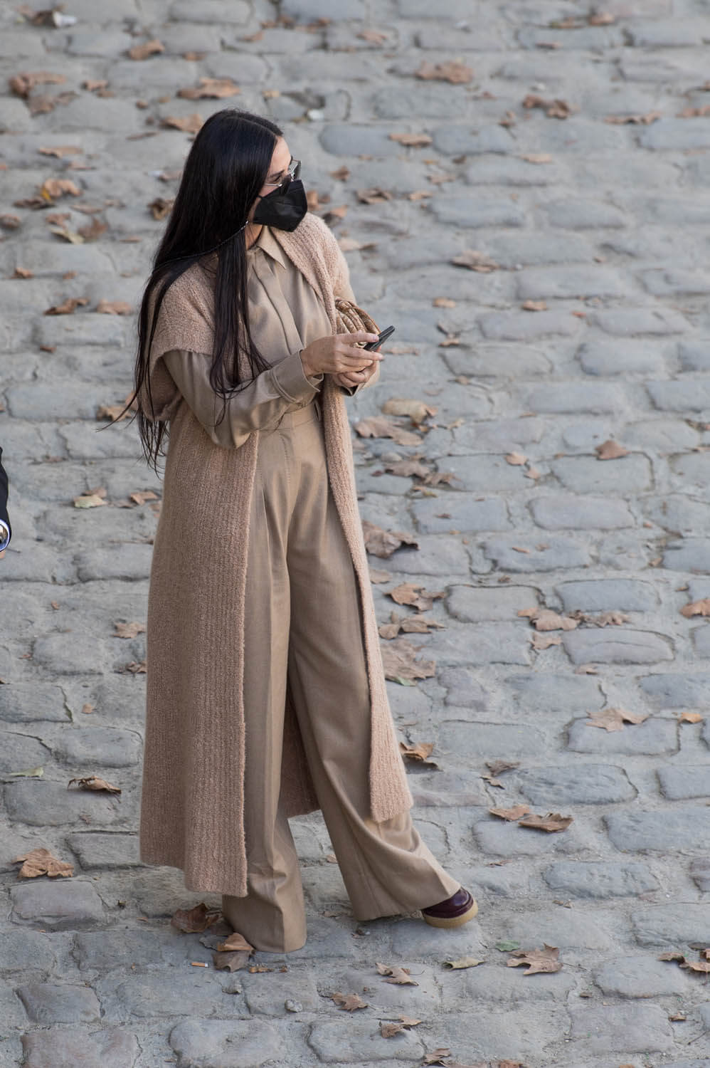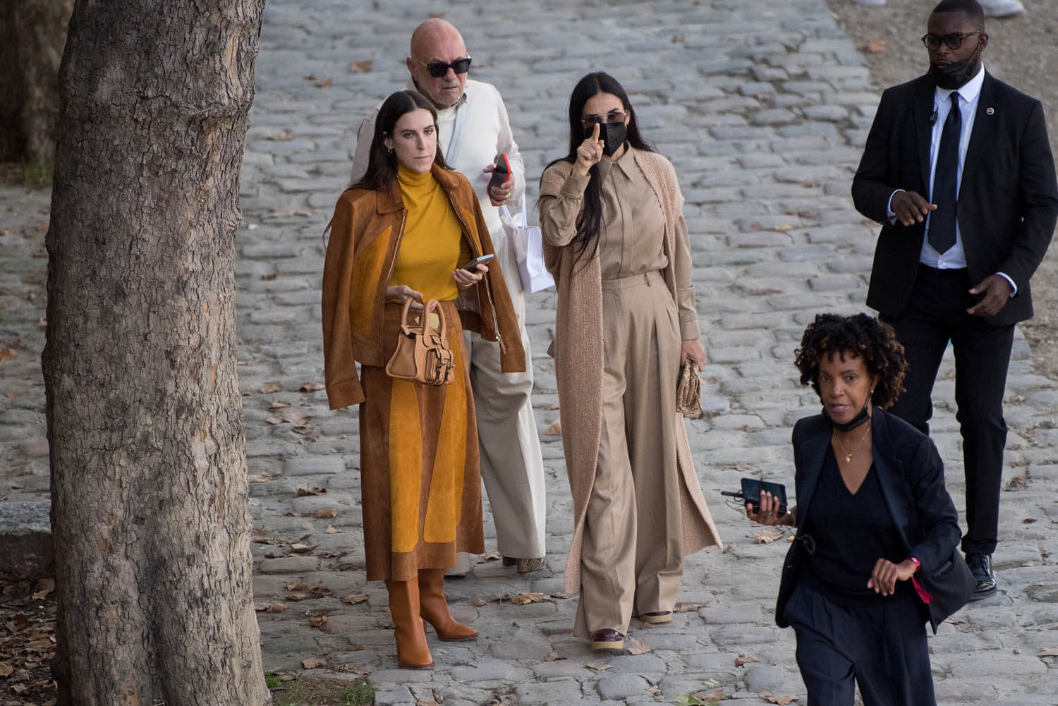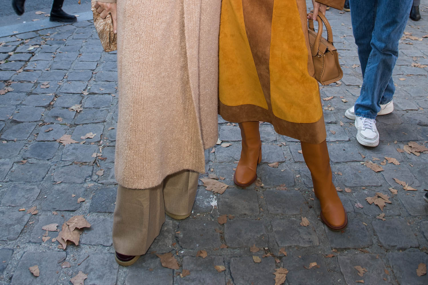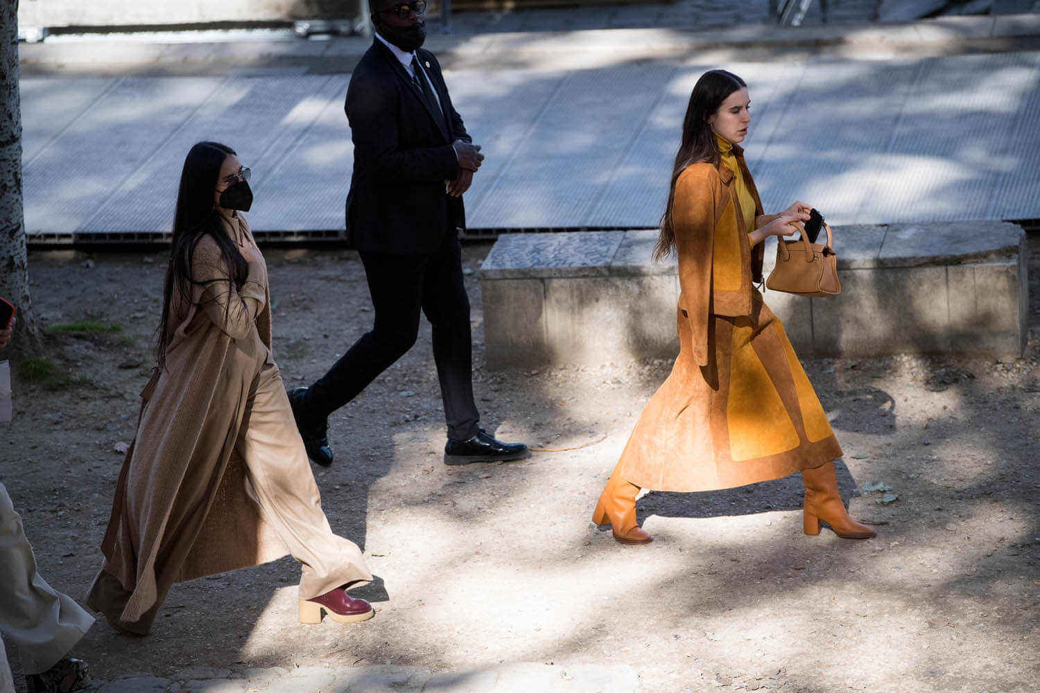 This is coordination without super-matching. The lengths of both fits work together. Demi is in monochrome camel, several layers, and I wish we could get a better look at those boots because I’m pretty sure they’re excellent and I want them even though I haven’t gotten a 360 view. Scout’s boots are also excellent and buttery, and she’s doing a monochrome thing too in browns and marigold, a little bit western, which is trending this season, but there’s a 70s vibe with the suede and silhouette.