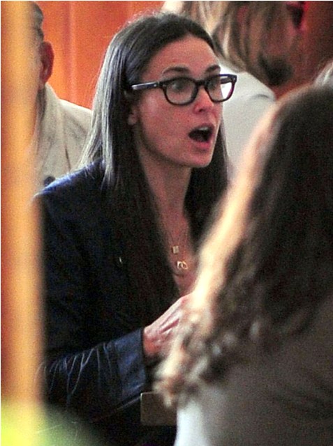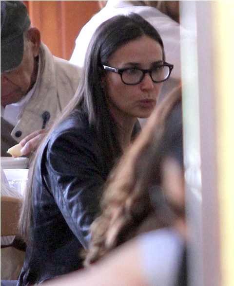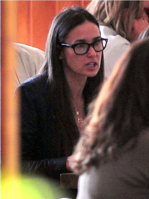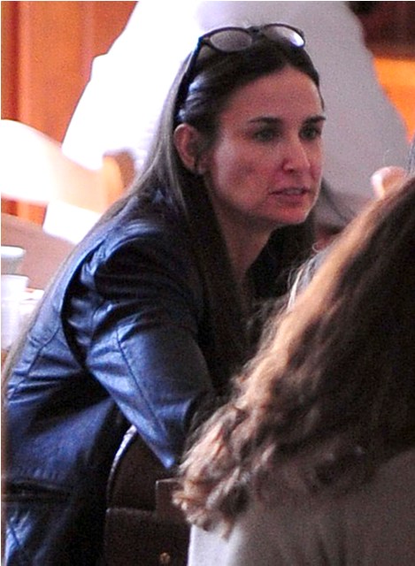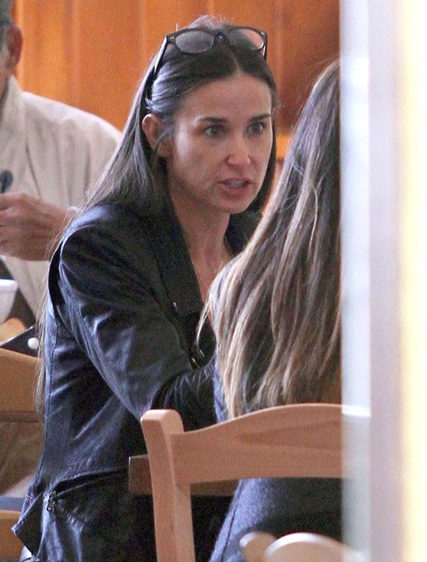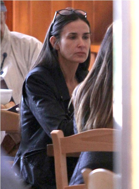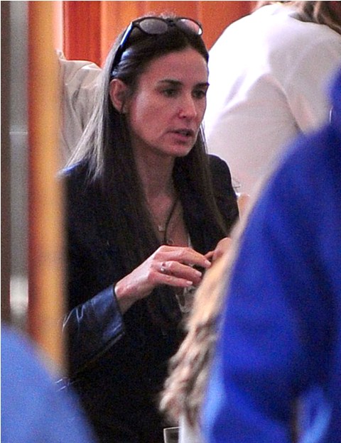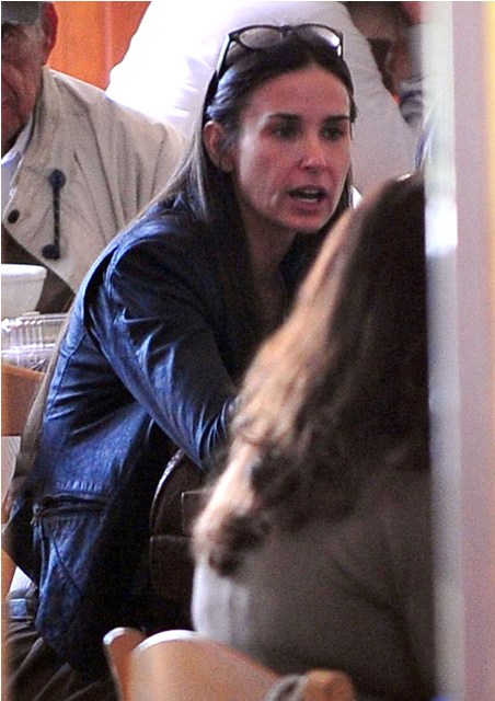 Demi Moore met up with a friend for lunch the other day in Brentwood. She was casually dressed, she was not made up, she didn’t seem to be aware that she was being photographed. Upon exiting, she covered up her face. Demi does not like having her face shot when it’s not “ready”.