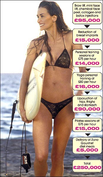 In light of the report today in the UK Daily Mail, perhaps it"s timely to revisit a post from the past - an article I wrote in 2004 after British tabloids first starting yammering about her alleged and expensive cosmetic enhancement. 40 might be the new 30 but it don"t mean it"s not hard work. At the time, Demi was promoting Charlie"s Angels 2 and after a couple of years in seclusion in Idaho, she re-emerged not only re-energised with a brand new younger beau but also re-slimmed, as illustrated beautifully in that beach bikini scene when she comes out of the water, wet and wild and draw droppingly fit. Check out the before and after. First - Demi in 2001, not unattractive but decidely different from what you see next door. It"s a graphic from one of the clever rags, breaking down the work and the cost associated with each procedure. Brilliant, non? Ok. So she"s probably had some help. Probably a LOT of help. But still...who cares? The result is gorgessity. And I can tell you from when she was in Toronto in September for TIFF - bitch doesn"t look a day over 28. And not in a bad way either. Demi Moore glows. She doesn"t look frozen (hello Kidman), she doesn"t look bloated (hello Presley), she doesn"t look fake but she does look un-frickin-believable. And given that she has to keep up with the hotness that is Ashton - minus the nasty ass clumps of sprout on his face - I say giv"er. When done right, surgery can be spectacular, savvy?