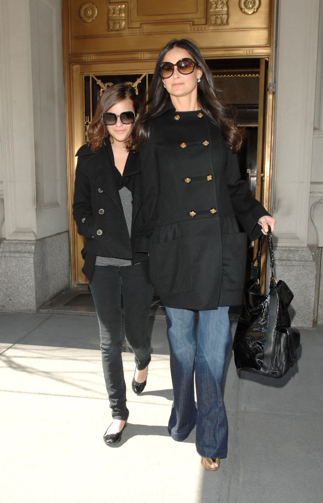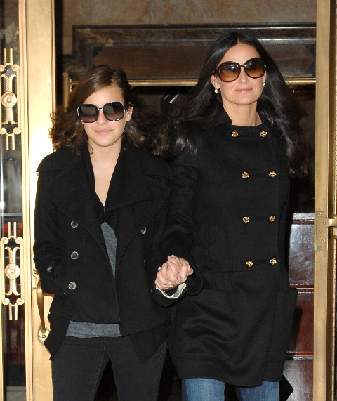 Demi Moore in New York headed out of her hotel with youngest daughter Tallulah Belle. My previous comments about Tallulah are here and as you can see, at 14, she’s already training for it. Like Ali Lohan. And Miley Cyrus. That common denominator is hunger – hunger for fame, for attention, coming alive in the presence of a camera, as evidenced by that smirk of satisfaction playing at her lips….