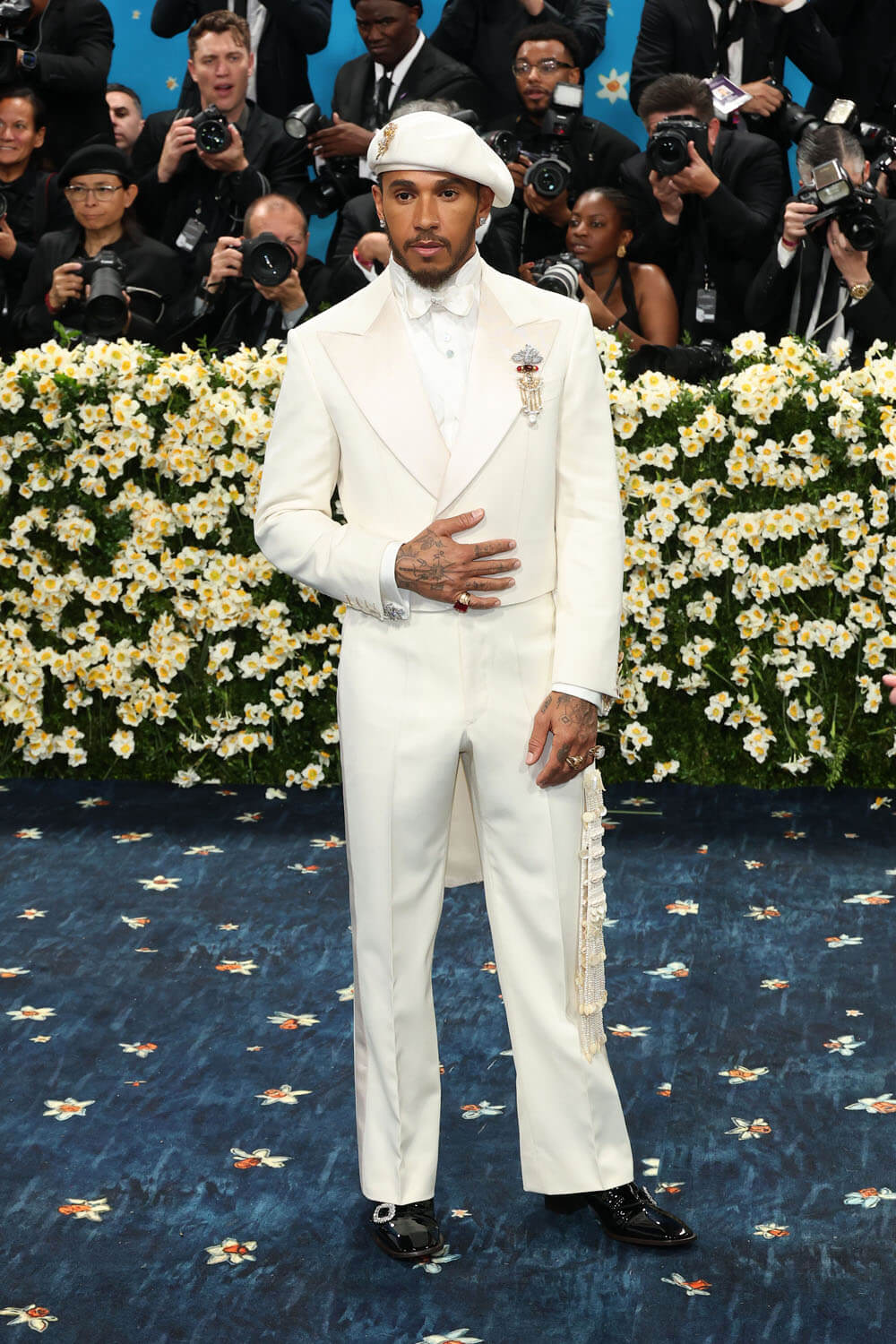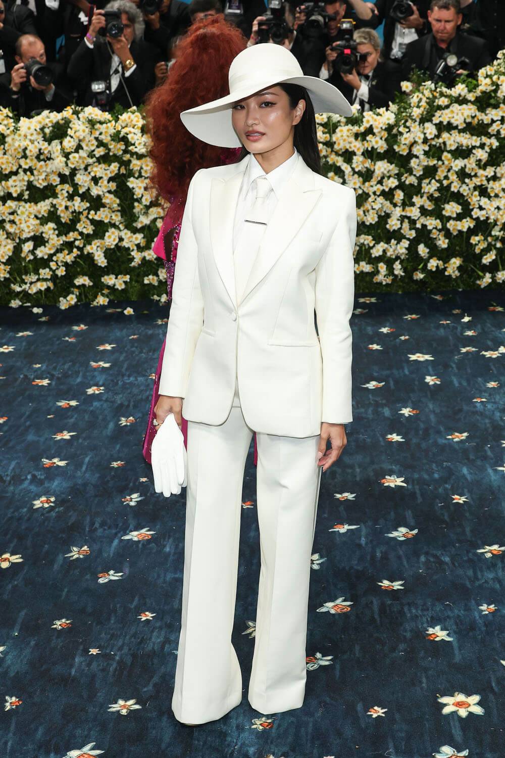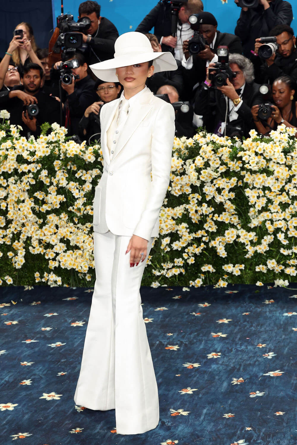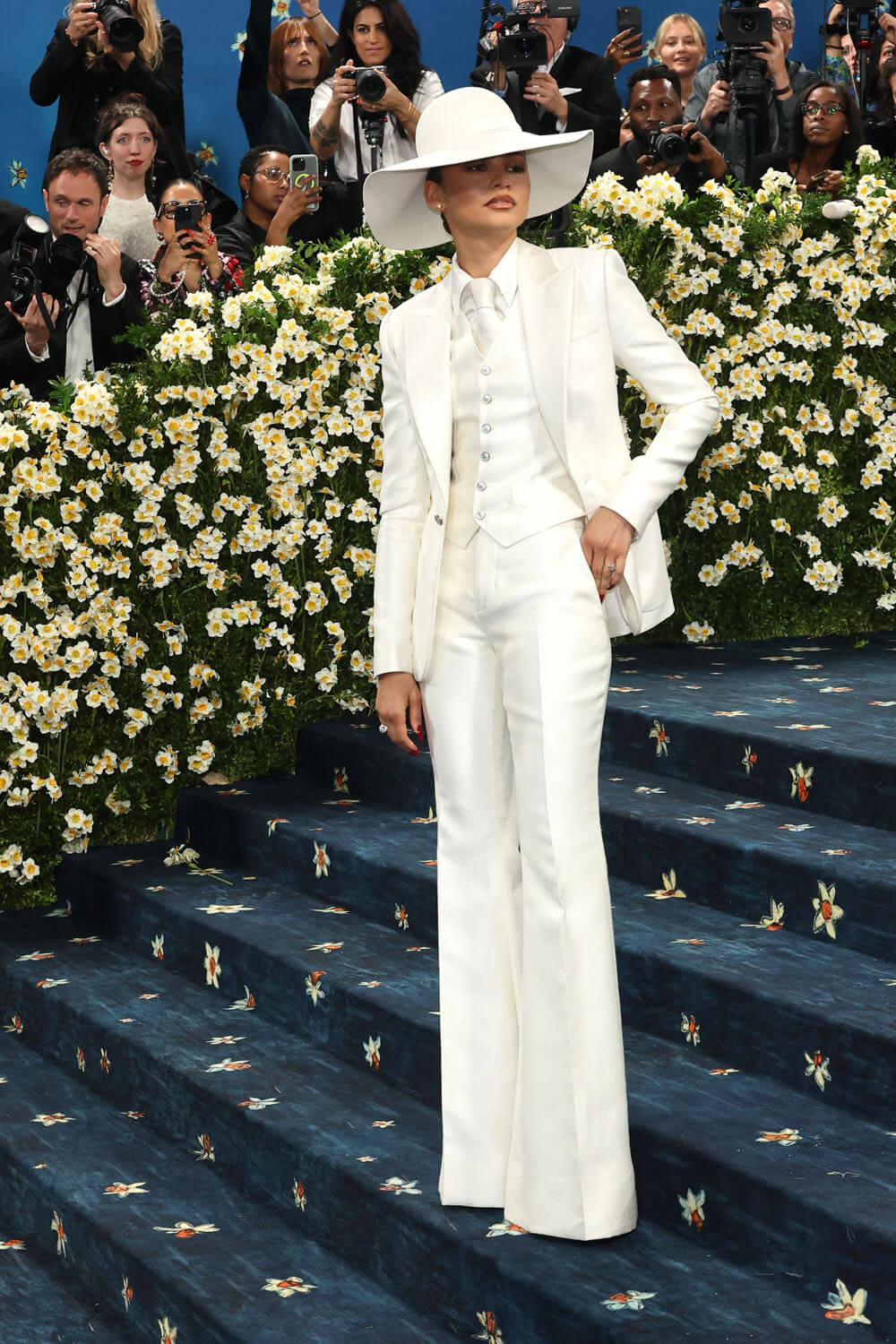 Zendaya was in custom Louis Vuitton by Pharrell Williams. She’s a brand ambassador, it was not a surprise to see her in the design. And it was not a surprise either that it was a twist on the zoot suit, considering the theme of the night. It was widely predicted ahead of the event that many people would show up in their respective interpretations of the zoot suit, and they did, and also in white, always a popular colour, but especially for an event where tailoring and dandyism was on display.