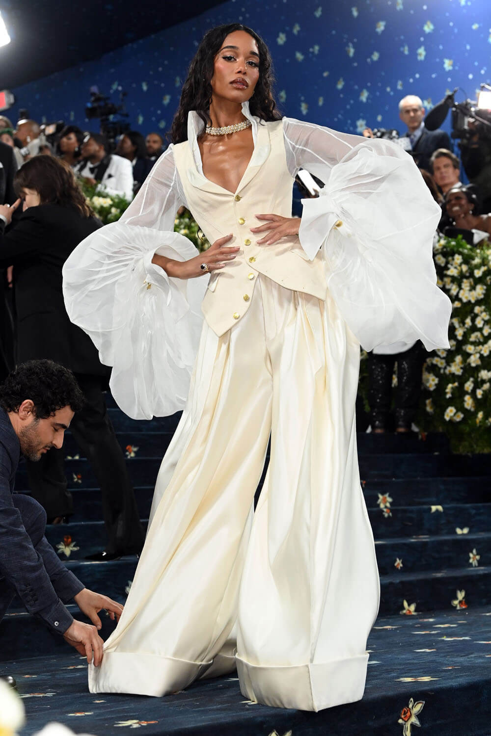 Laura Harrier’s Met Gala look, designed by Zac Posen for Gap Studio, was all about family, the Black Dandies in her family, her father and uncle. It’s fitting too because when I saw her outfit, I thought about America’s Founding Fathers, or at least how they were presented in Hamilton. It’s the waistcoat and the billowing sleeves. But thoroughly modern on the bottom with those wide leg pants.