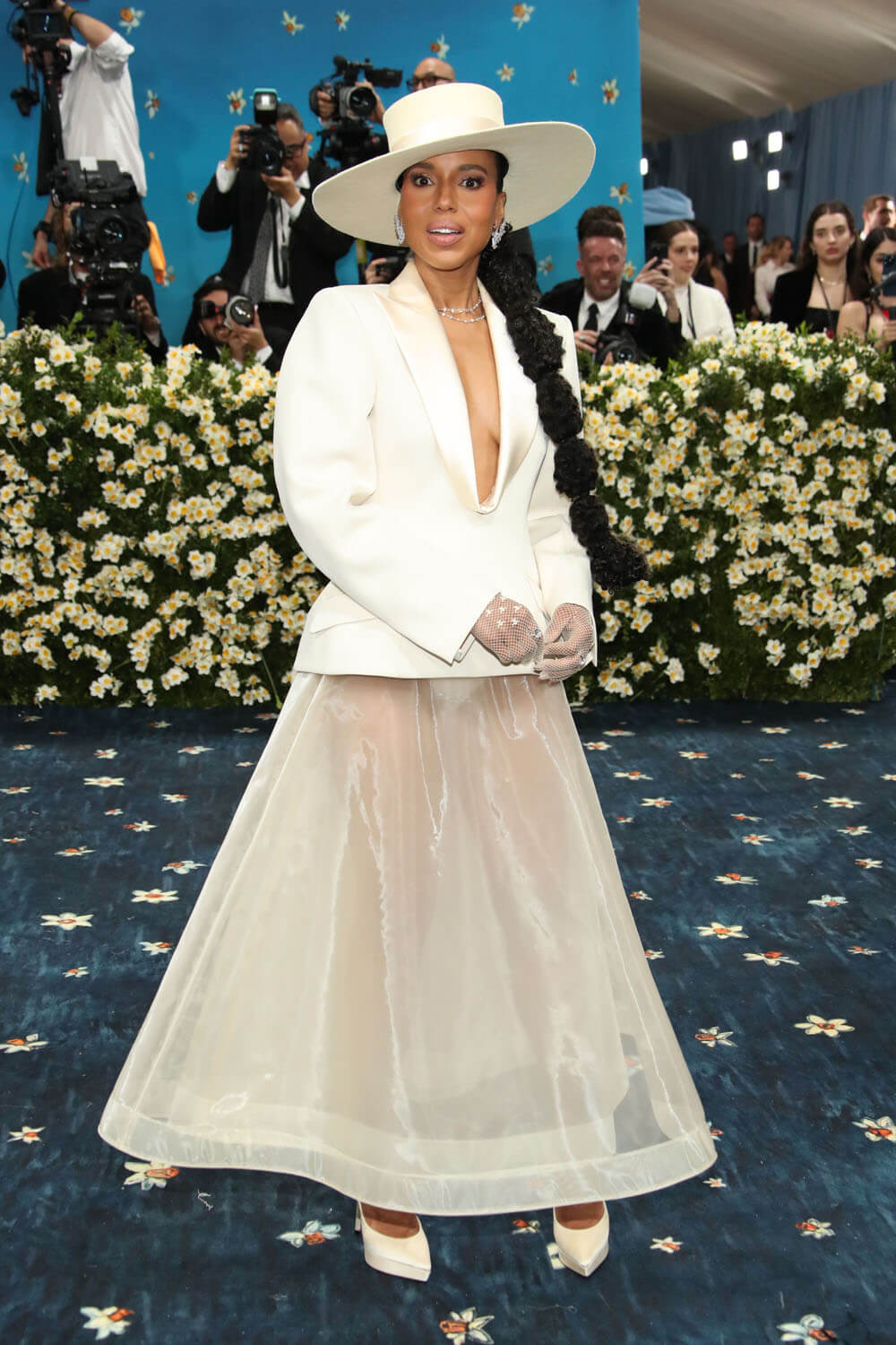 But the white/ ivory/ pale yellow train isn’t stopping yet. Next up, Kerry Washington in Jonathan Simkhai. It’s morning after the wedding, bridal but untamed, with that exquisite open back and the sheer skirt that betrays its demure shape and length. I don’t know exactly what she means by “IYKYK” on Instagram but I can tell you that one of Prof Miller’s earliest references to the Black Dandy was a stage character who wore a white hat.