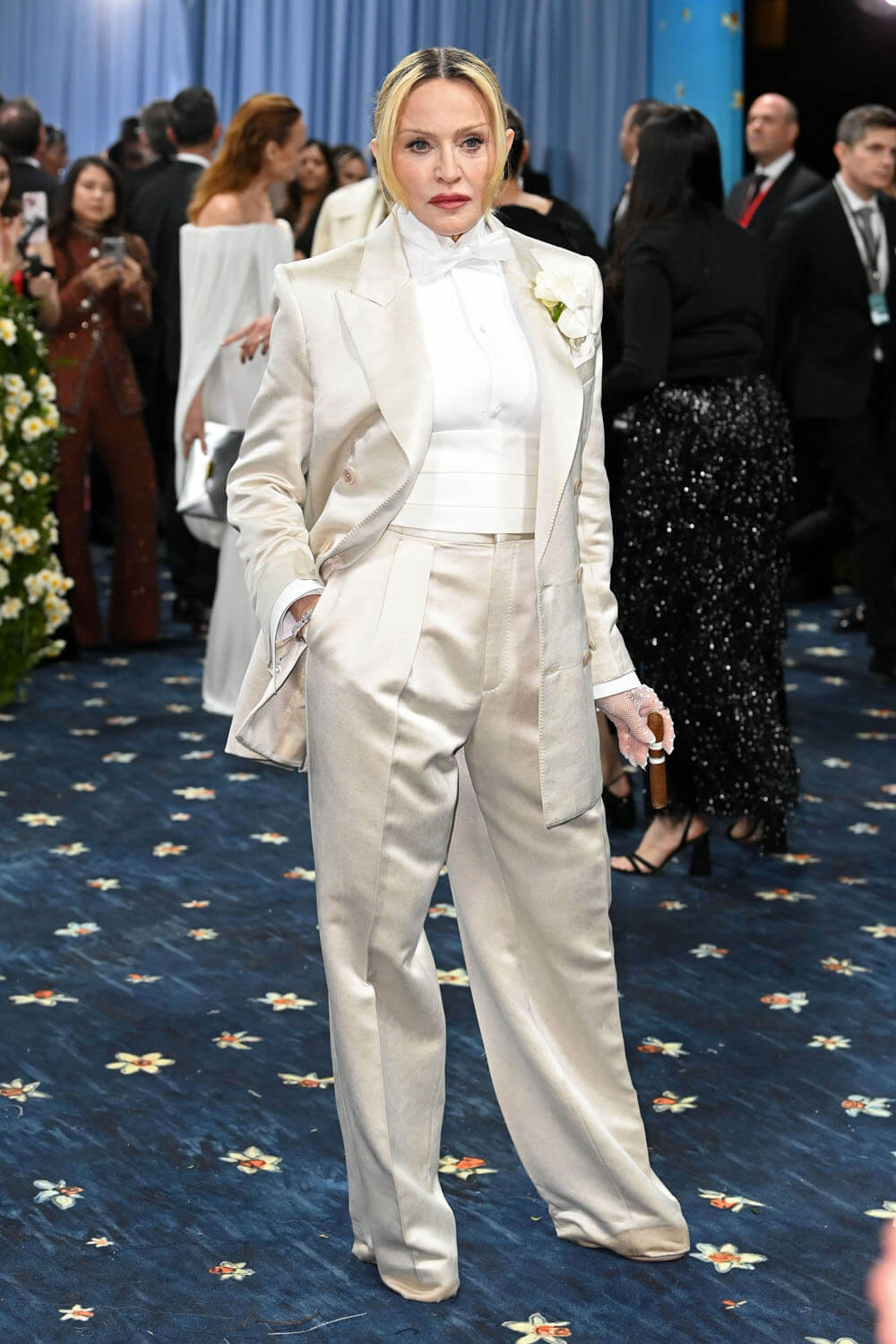 Madonna in a suit, black or white, is nothing new. It’s “Vogue”, it’s “Express Yourself”, it’s being the groom to two brides, Britney and Christina, at the VMAs. This white suit is Haider Ackermann for Tom Ford, and she went full boss with the cigar. This continues a tradition of Madonna basically paying tribute to herself at the Met Gala. Every year I feel like she wears various iterations from her own image catalogue. I don’t know that the execution was to her standard though, because this suit, seems… unpolished. It’s not as crispy as a white suit needs to be when you consider how the colour exposes any lack of finish. In comparison to the other white suits in this collection, it’s far from the best.