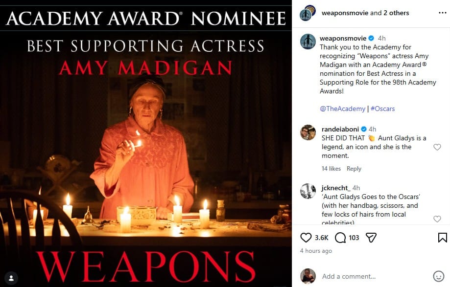 Amy Madigan was nominated for an Oscar for Weapons but she has been at the Oscars before with her previous nomination and with Ed Harris. They’ve been married over 40 years!