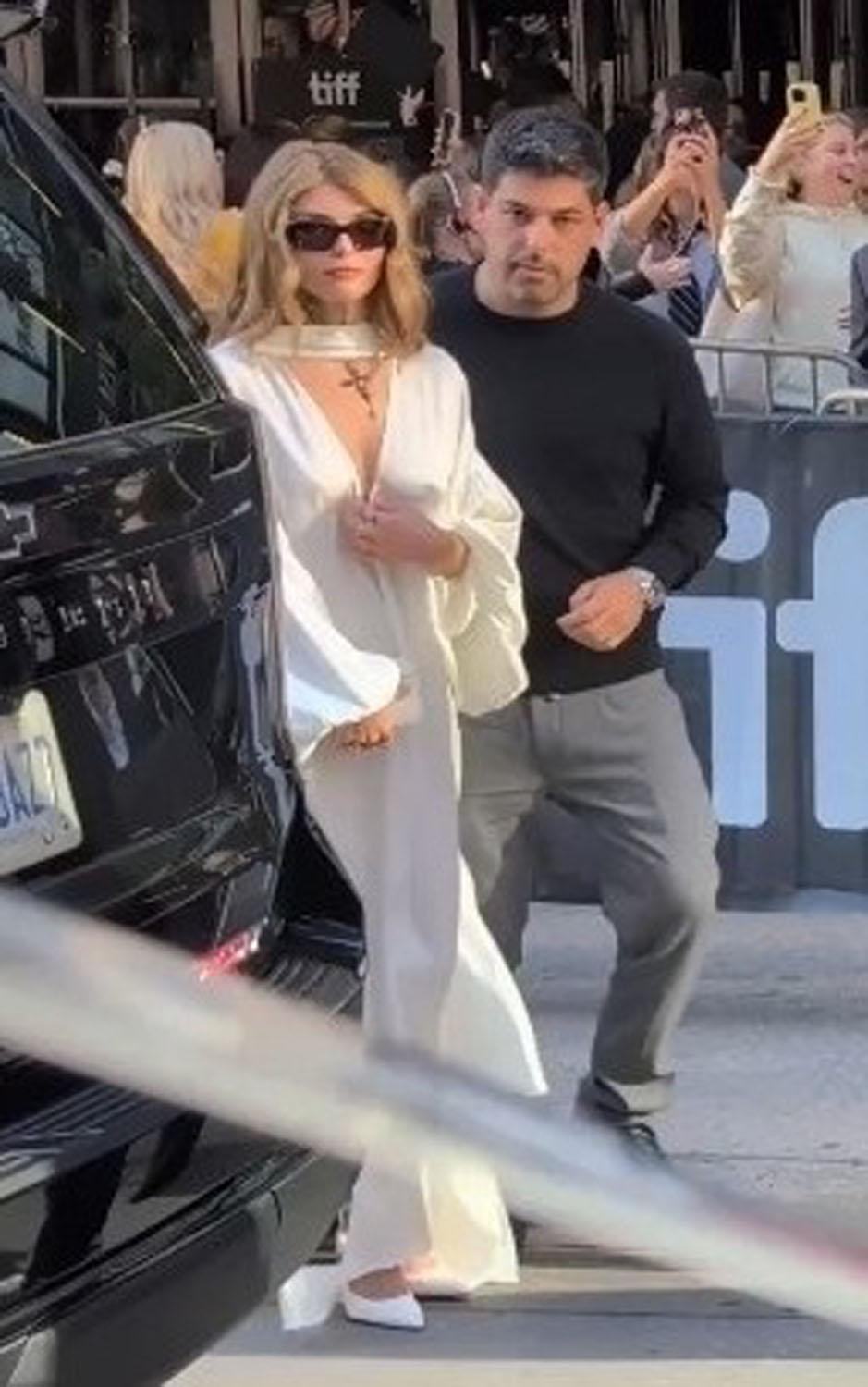 Like, obviously, it’s much easier to blend in and go incognito if you’re in black, surrounded by publicists and studio teams in black, and security in black, and the SUVs are black, and most of the still photographers in the photo pit wear black. But that was not the choice she made. Jacob and Olivia arrived together, he was wearing a black suit but it’s hard to miss him since he’s a giant, and there she is, right next to him, noticeable AF in white with shades on, LOL.
