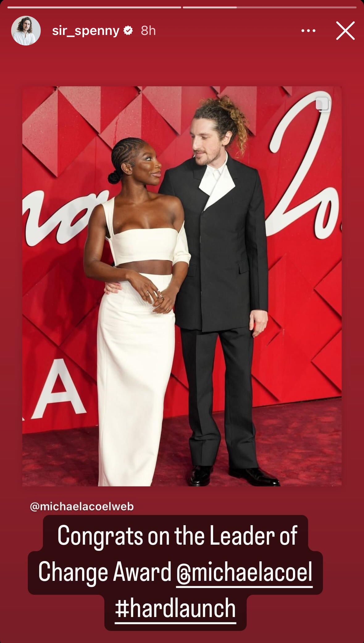 In other Michaela news though, she looks amazing in this Ferragamo look and walked the carpet with Spencer Hewett, a retail and ecommerce entrepreneur, founder of the company Radar. Who… I think?... is now her boyfriend? Because this is what he reposted on Instagram: