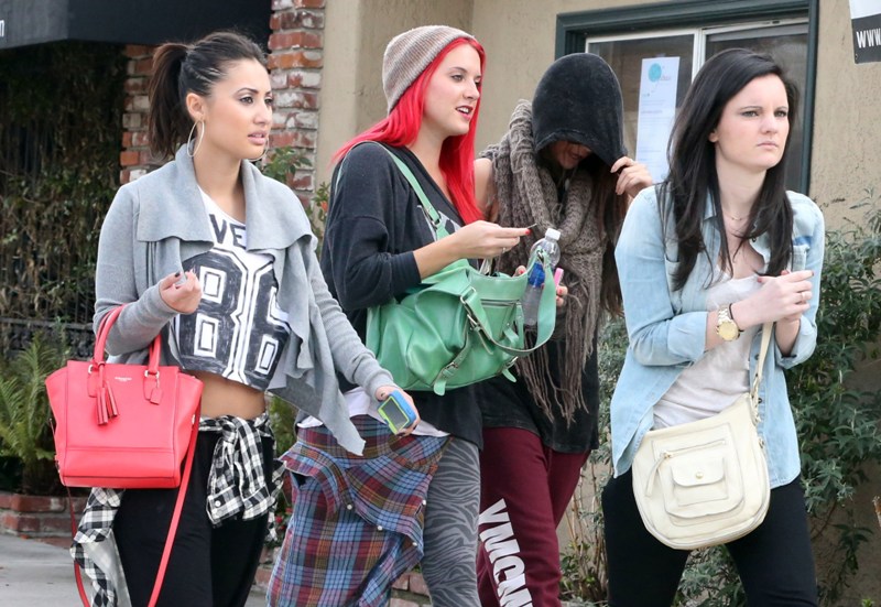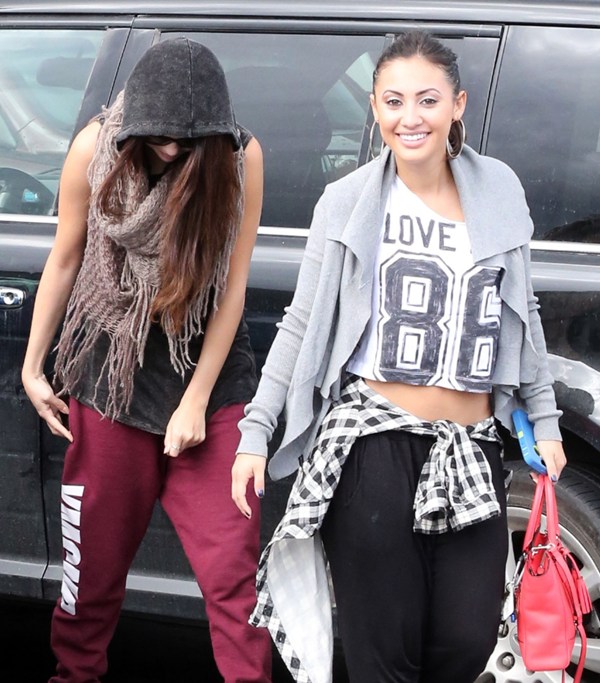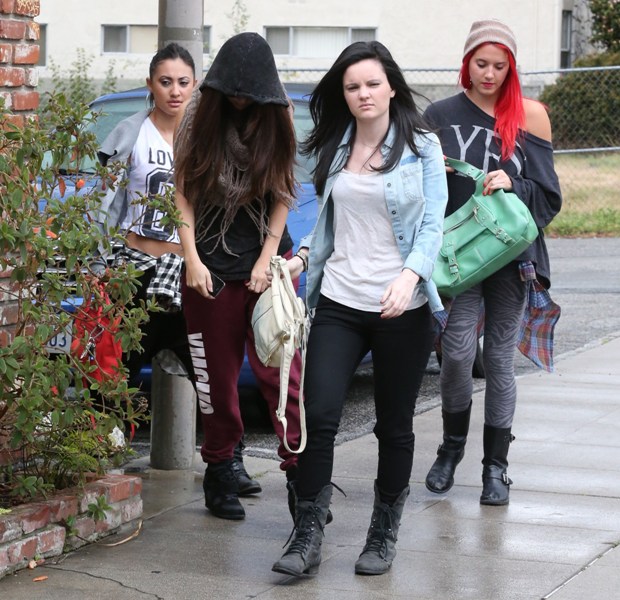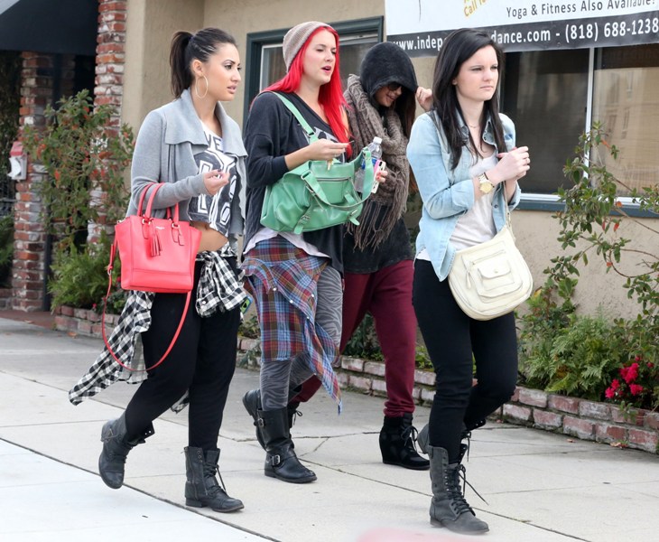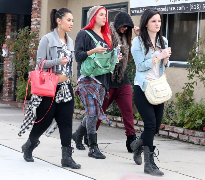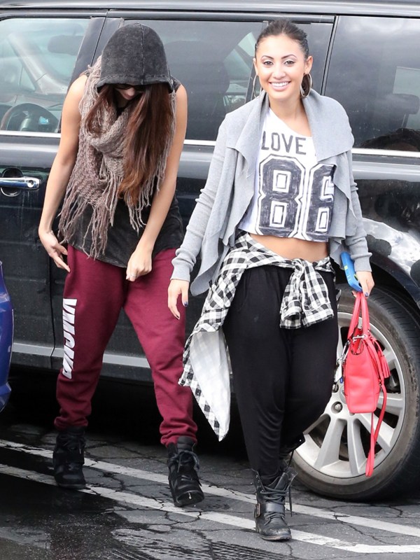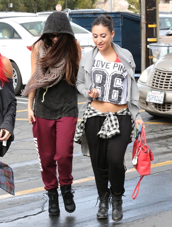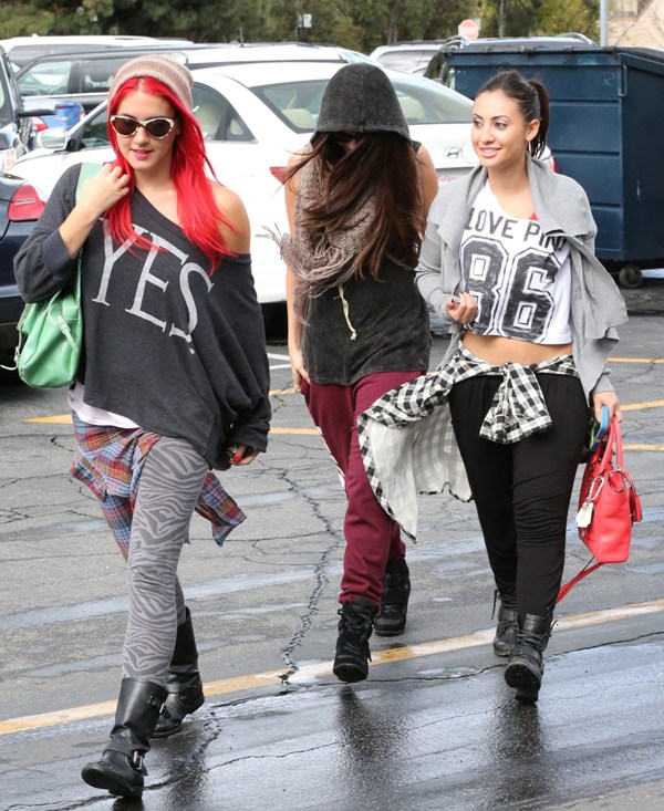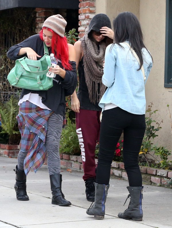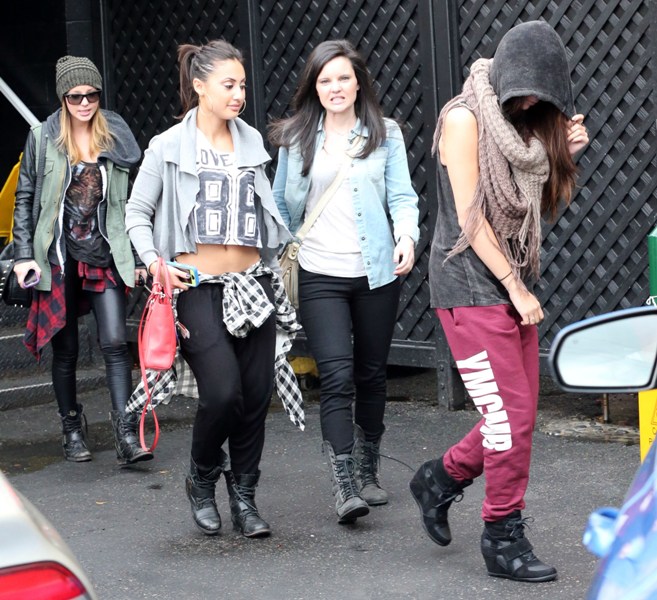 Attached -- Selena and friends arriving at the dance studio the day they put together the video, and the day before in a really sh-tty outfit for a children’s benefit.