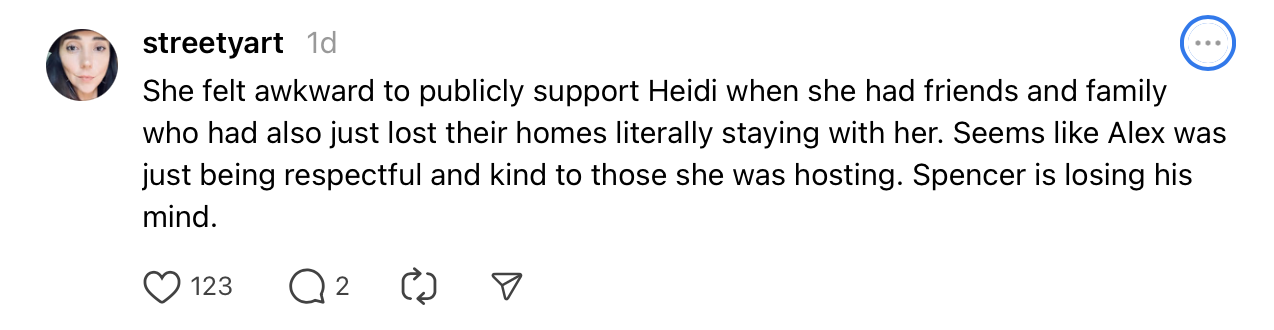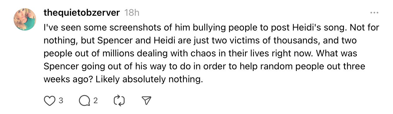 As easy as it may be to chalk all of this up to Spencer’s inherent reputation as a transgressor, it’s important to extend a certain amount of grace, too, to everyone navigating some of the most difficult days of their lives, including Alex, who, as this person suggested, may have found it inappropriate to share a song while hosting people who had been displaced.