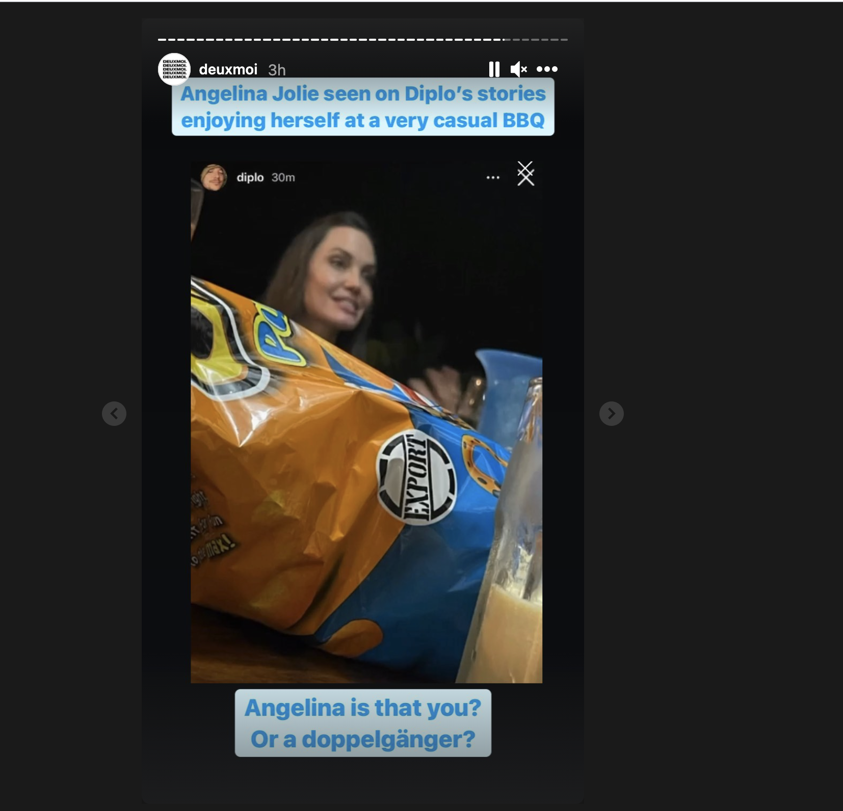 Angelina Jolie and Diplo would be pretty high on the list, right? DeuxMoi posted this screenshot from Diplo’s story in which he and Angie were at the same outdoor barbeque.