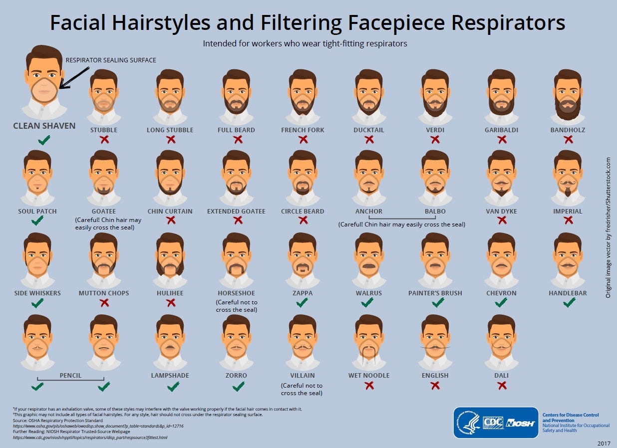 People online were already talking about the clearage between Coop’s bottom lip and his chin, and then Kate, a member of our wonderful Squawk community posted this in the chat – from the Centers for Disease Control, a beard chart that includes around 30 different facial hair styles, with names, designed for mask wearing guidance.