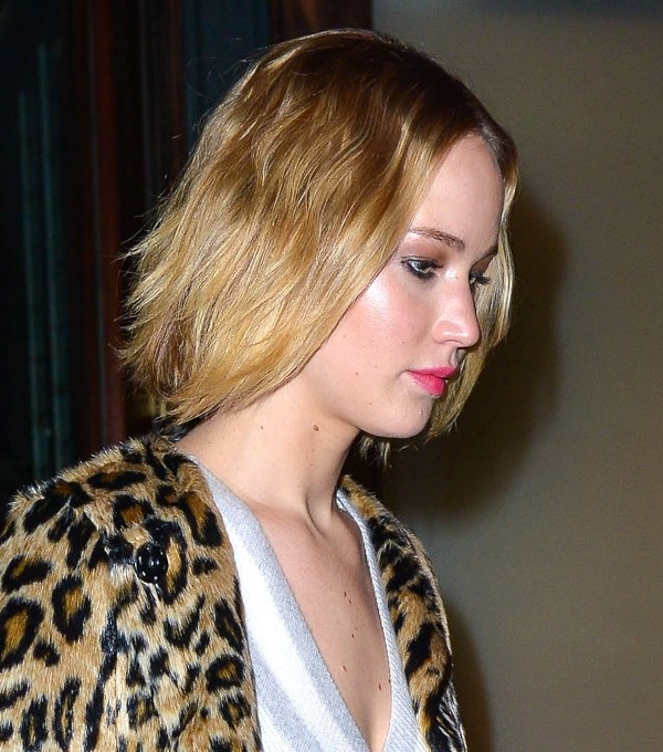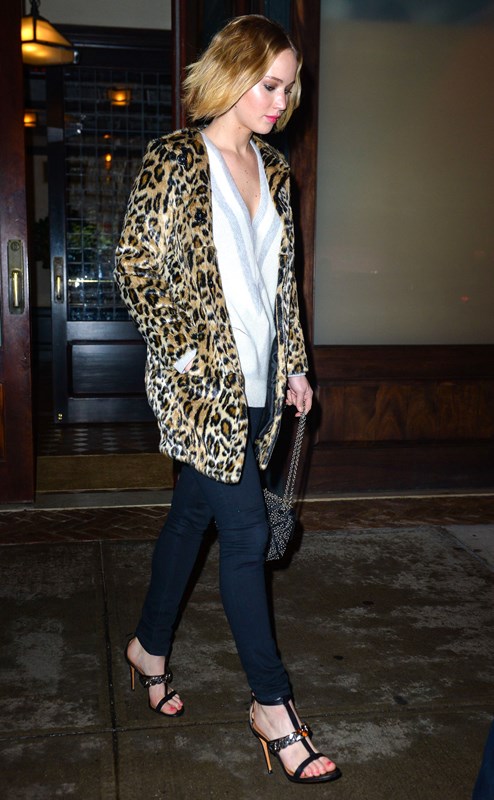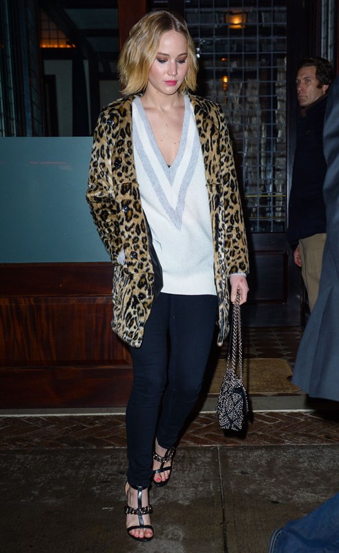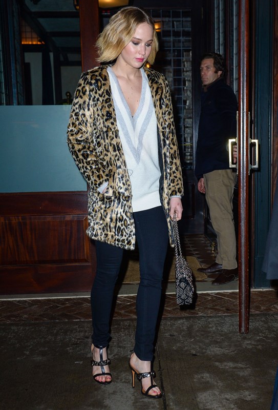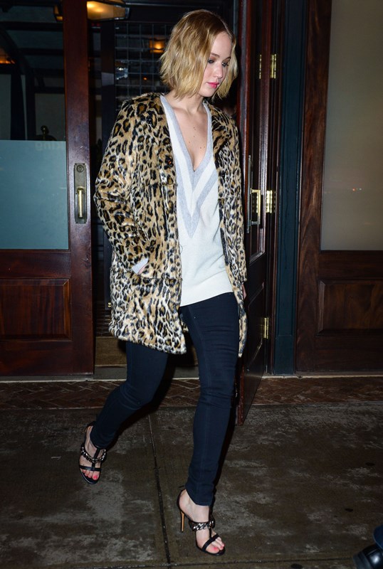 Here she is in New York last night after seeing her friend and frequent co-star Bradley Cooper in The Elephant Man.