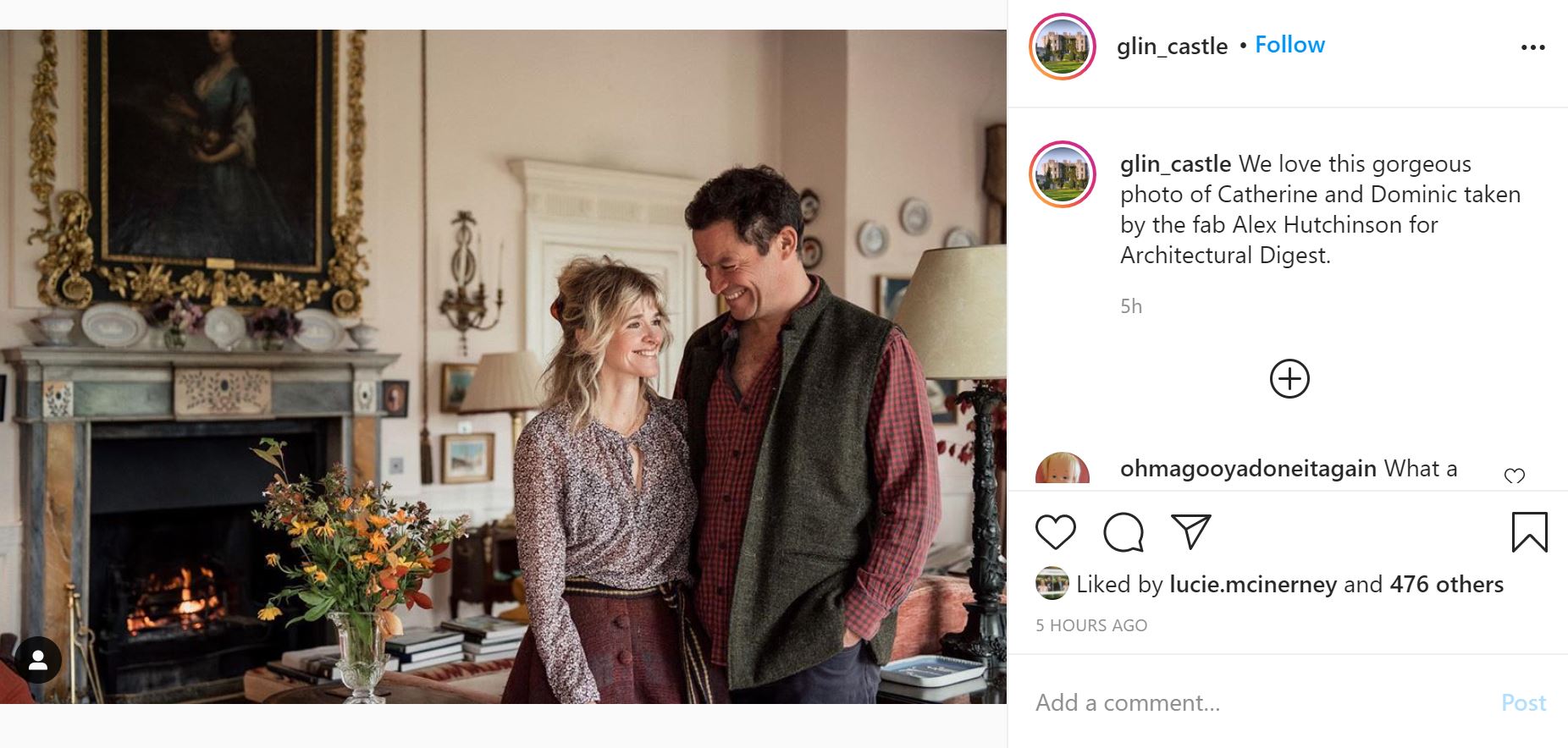 Glin Castle is the ancestral seat of Catherine’s family; she owns the property now and she and Dominic were featured together in Architectural Digest at the castle in January 2019. The outfits they’re wearing from that feature are the same as what they’re wearing in this photo on Instagram.