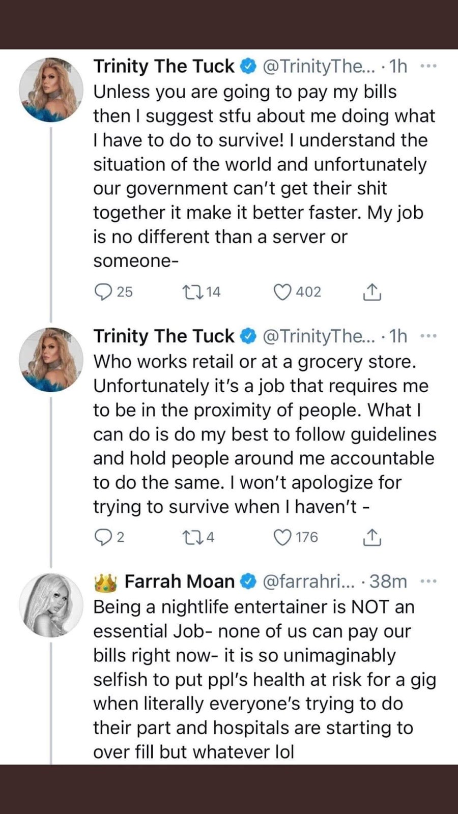 Unfortunately, because of deleted tweets, I haven’t been able to find the exact moment that sparked this latest controversy. However, it appears as though some Drag Race fans started criticizing All Stars 4 Winner Trinity the Tuck for doing a live performance at a brunch during a pandemic. In a tweet, she fires back at those who criticize her, claiming that she’s no different than an essential worker like a server or grocery store employee. (I know, right?)
