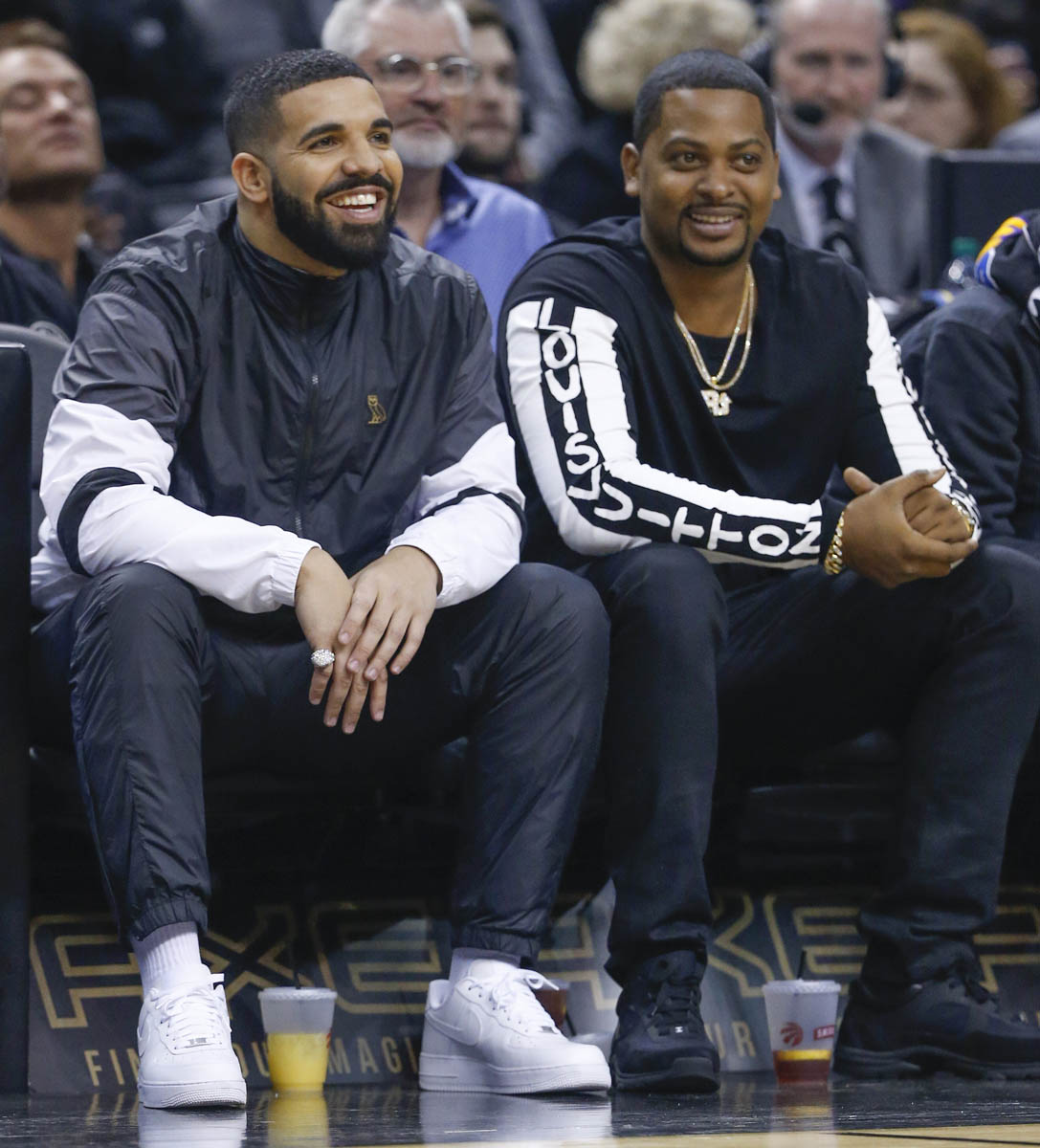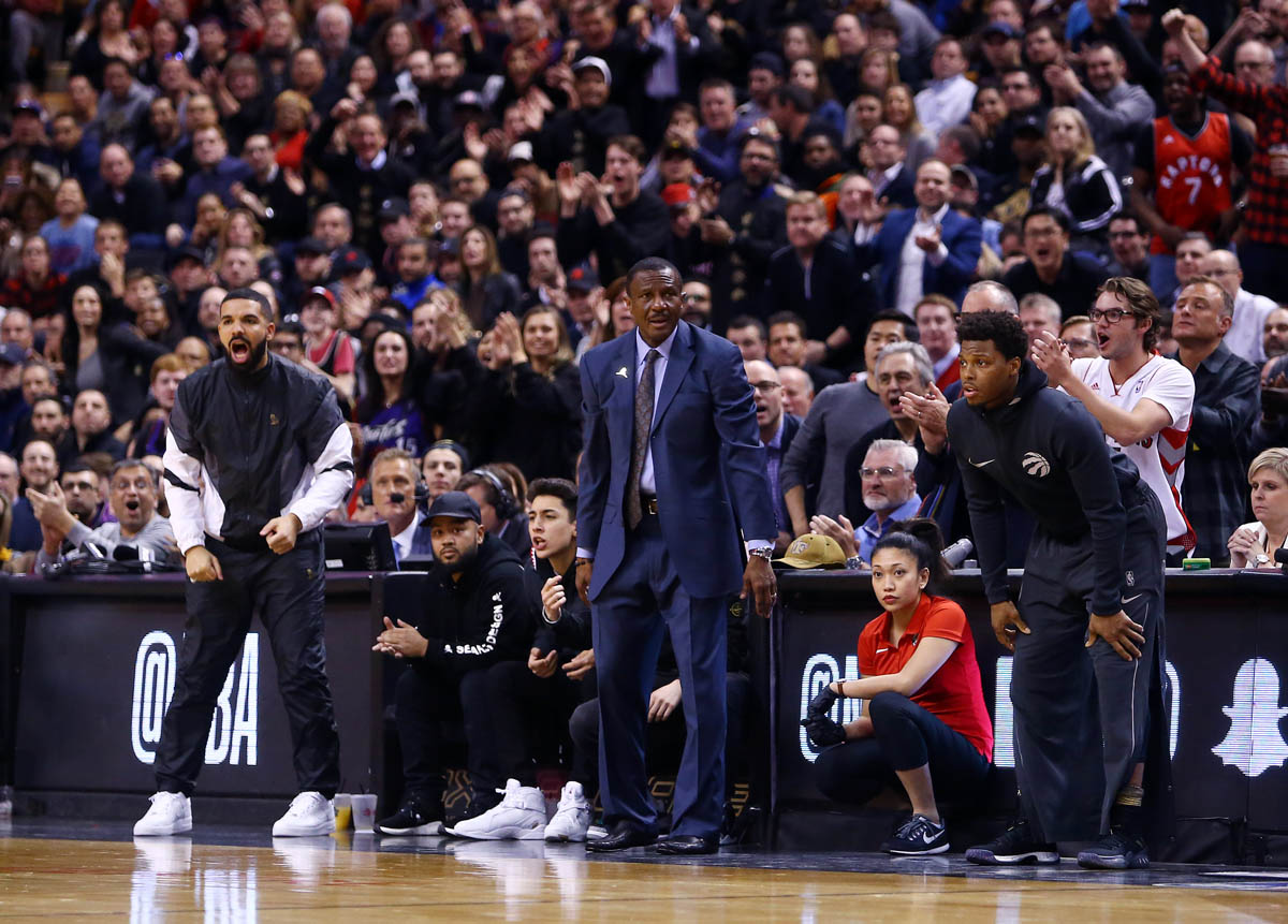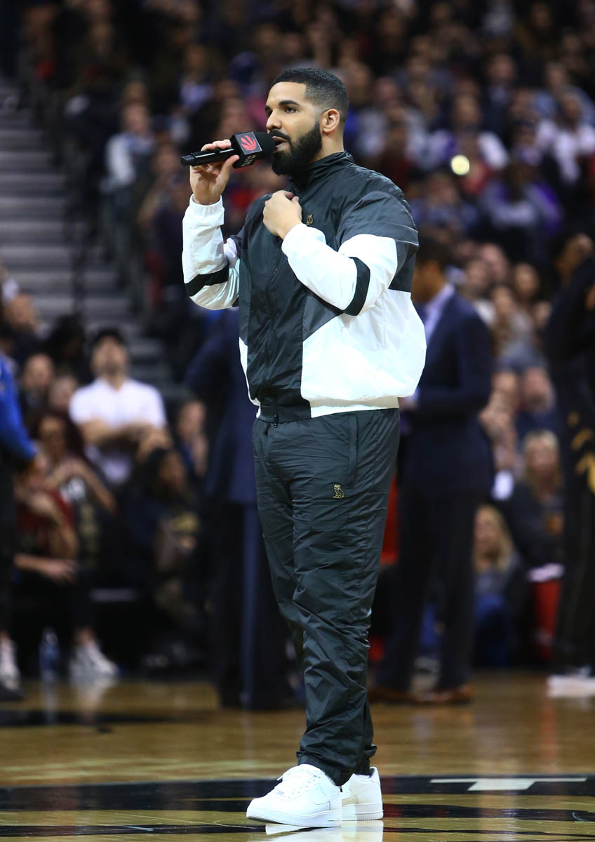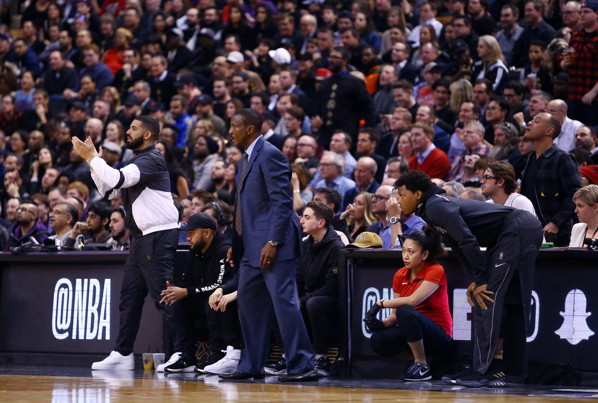 Here's Drake at the Raptors game in Toronto the other night.