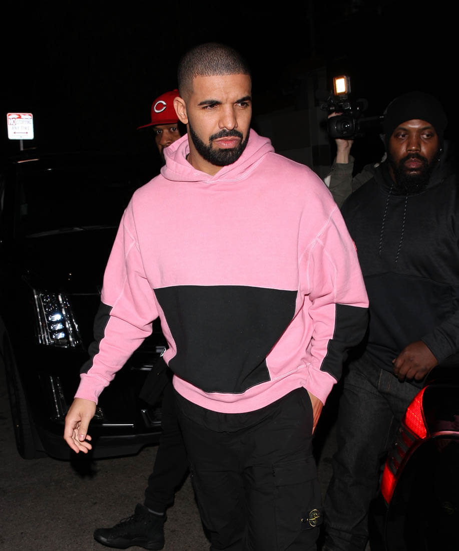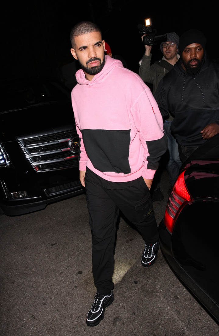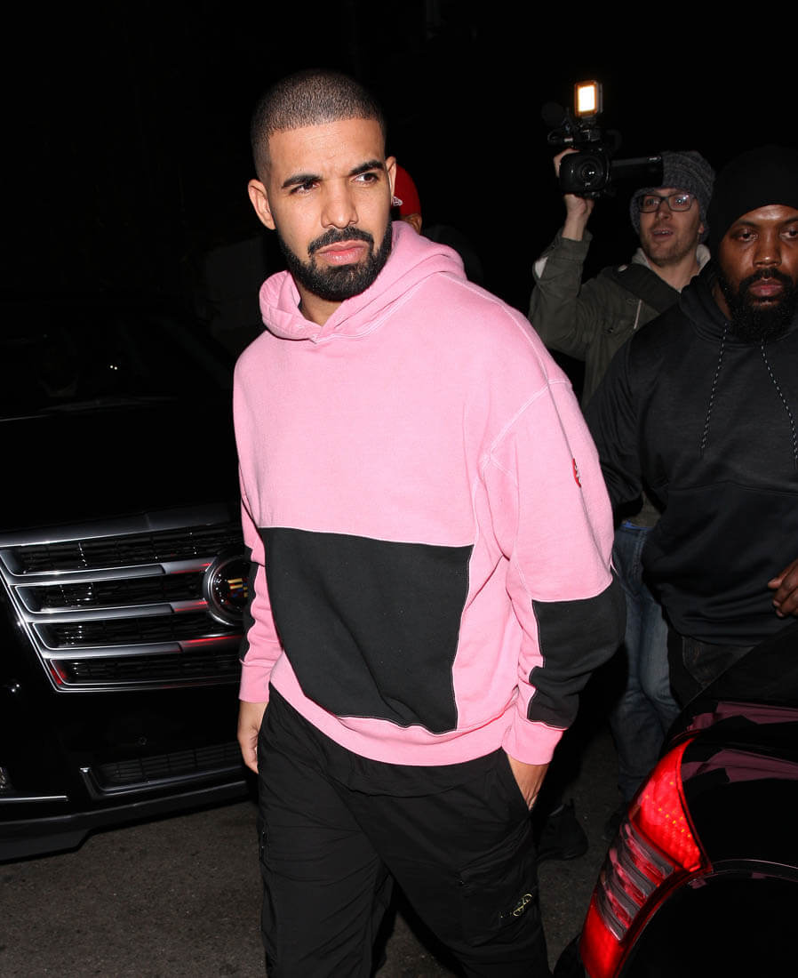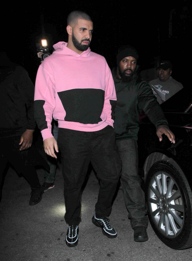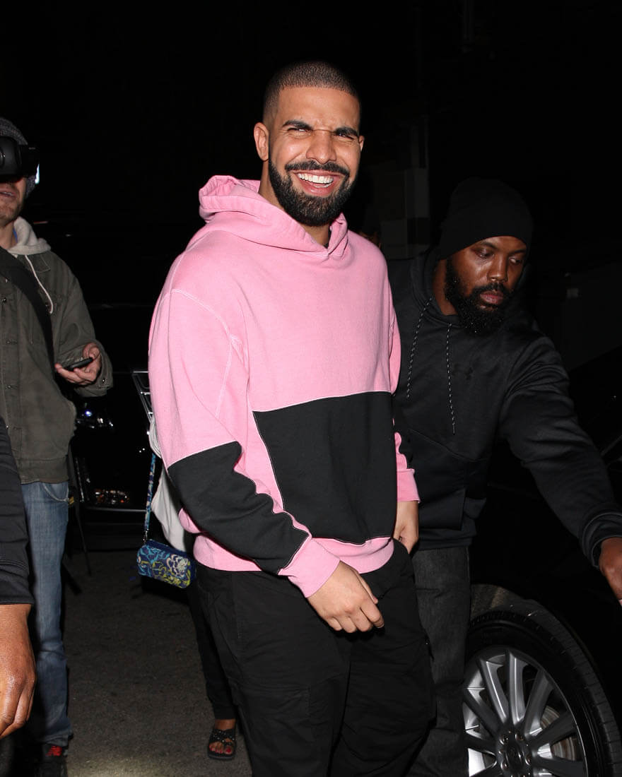 Here’s Drake leaving The Nice Guy last night, presumably before heading over to Khaled’s to start working. But not before a wardrobe change. Pink hoodie for dinner, yellow hoodie for the studio. I do love this pink hoodie though. I like how the black patches on the sleeves make it look like they’re tapered. And the black patch across he midsection, from some angles, matched up against the patches on the sleeves, give it kind of a cape effect.