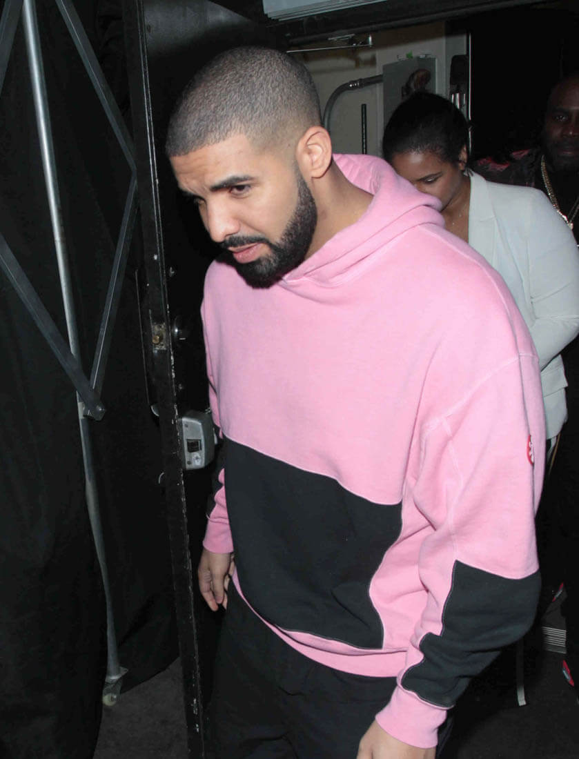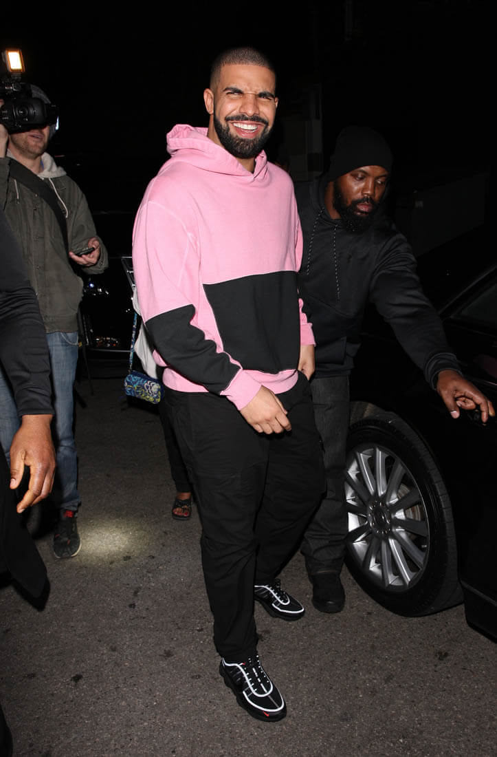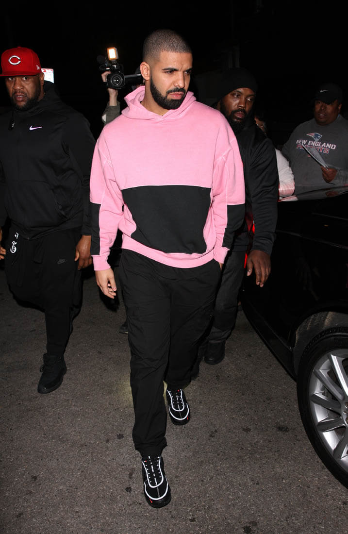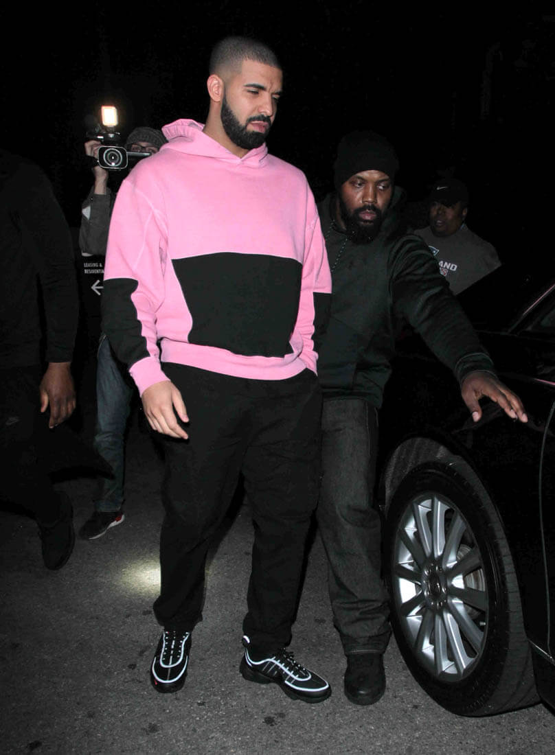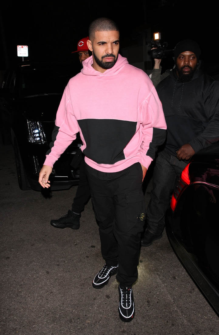 Here’s Drake leaving The Nice Guy last night, presumably before heading over to Khaled’s to start working. But not before a wardrobe change. Pink hoodie for dinner, yellow hoodie for the studio. I do love this pink hoodie though. I like how the black patches on the sleeves make it look like they’re tapered. And the black patch across he midsection, from some angles, matched up against the patches on the sleeves, give it kind of a cape effect.