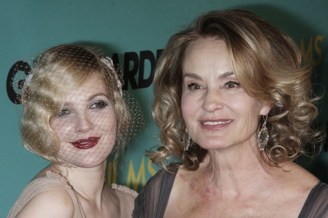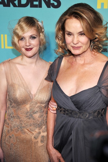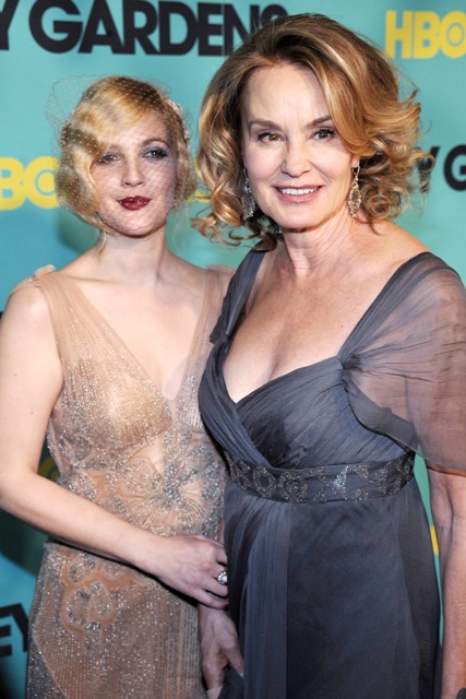 Last night in New York at the premiere of HBO’s Grey Gardens – Drew Barrymore and Jessica Lange taking centre stage promoting their roles as Big and Little Edie looking so much better than they did together at the Golden Globes, remember? Click here for a refresher.