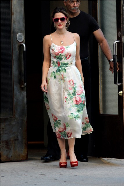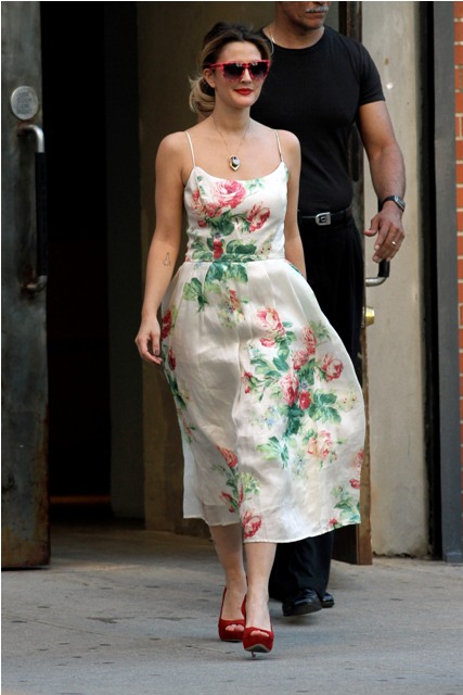 This is Drew Barrymore all flowered up leaving a photo shoot in New York yesterday. The photo shoot was presumably to promote her upcoming movie Going the Distance co-starring her real-life boyfriend Justin Long. Have you seen the trailer?