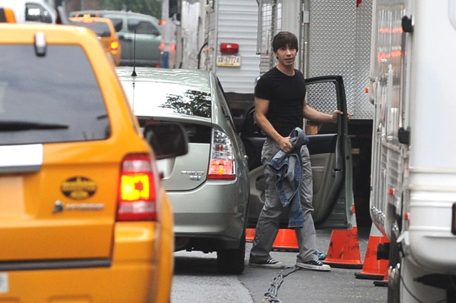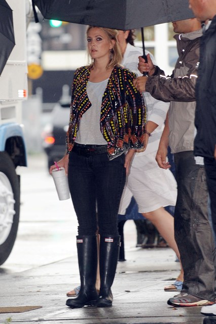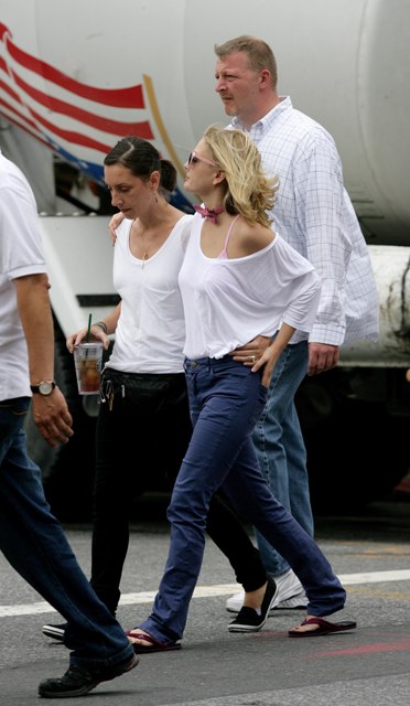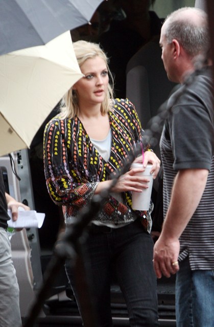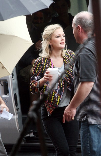 But first – she’s working on Going The Distance in New York, spotted on set yesterday arm and arm with a colleague while Justin Long lurked around showing off his big biceps.