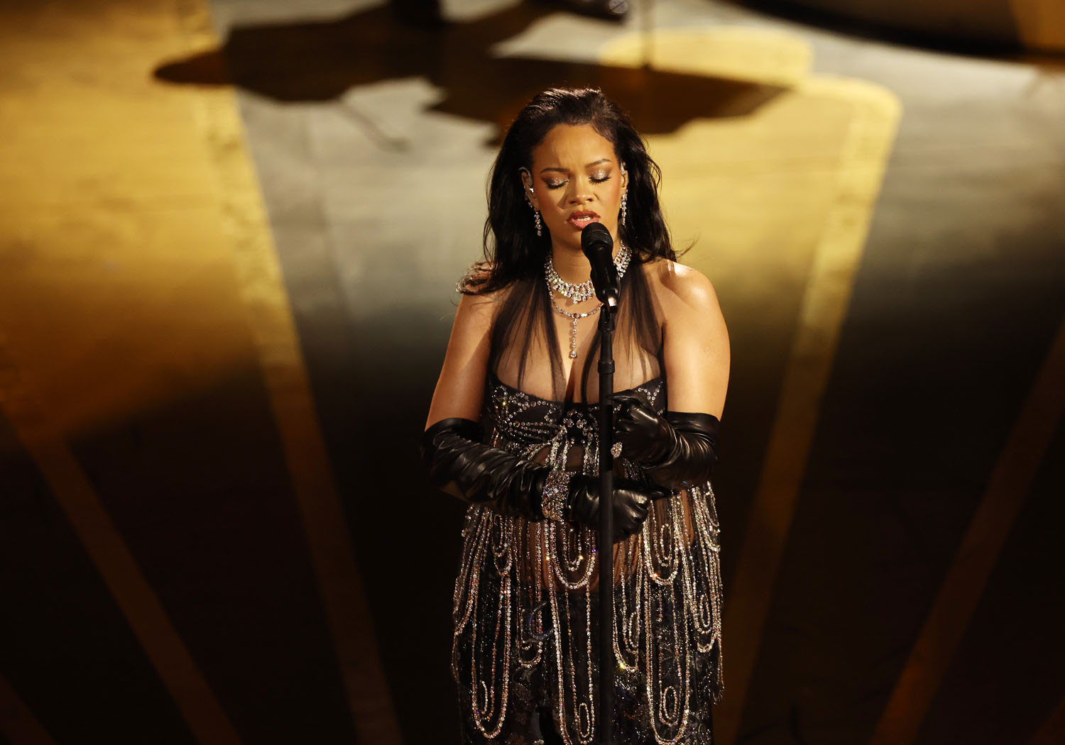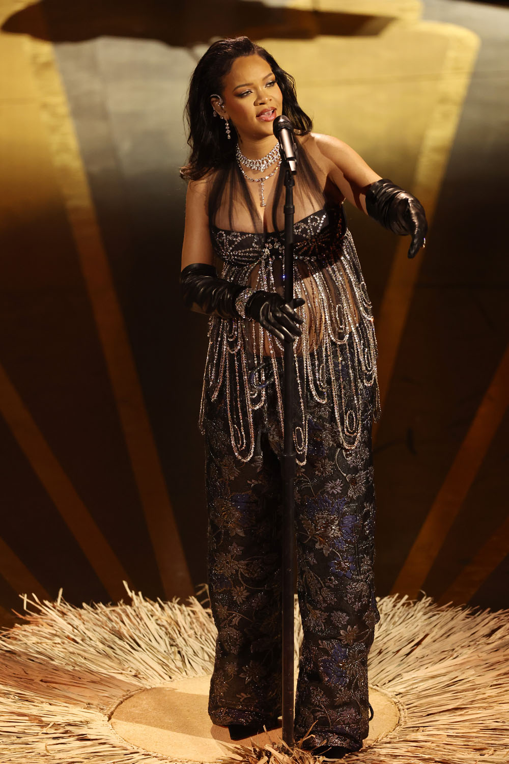 Rihanna’s vocal performances, rare as they are, are unique in that they’re for herself, first and foremost – you can see in the below clip that she’s often singing with eyes closed, it’s coming from inside her, and so I loved that she was somewhere inside this outfit. Somewhere, draped in black and sheer and diamonds (and pants!) , she was in there – but you don’t have to worry about specifically where, because every time you look, there’s a new angle to process and marvel at …yet you’re still not thinking about the outfit as much as you are Rihanna the woman, incredible in her own right.