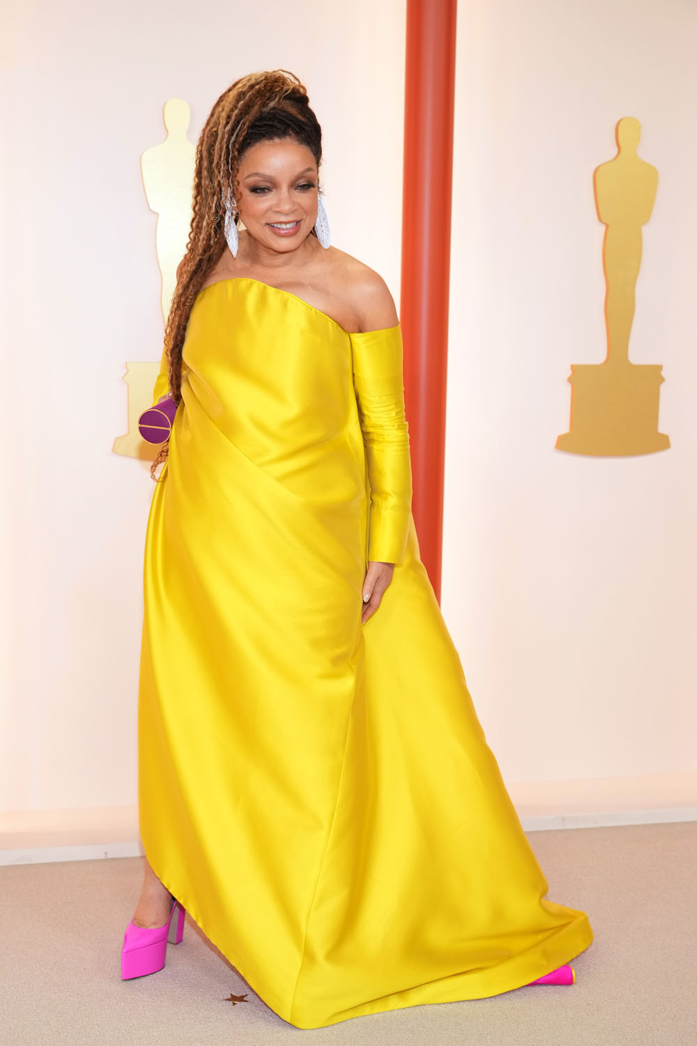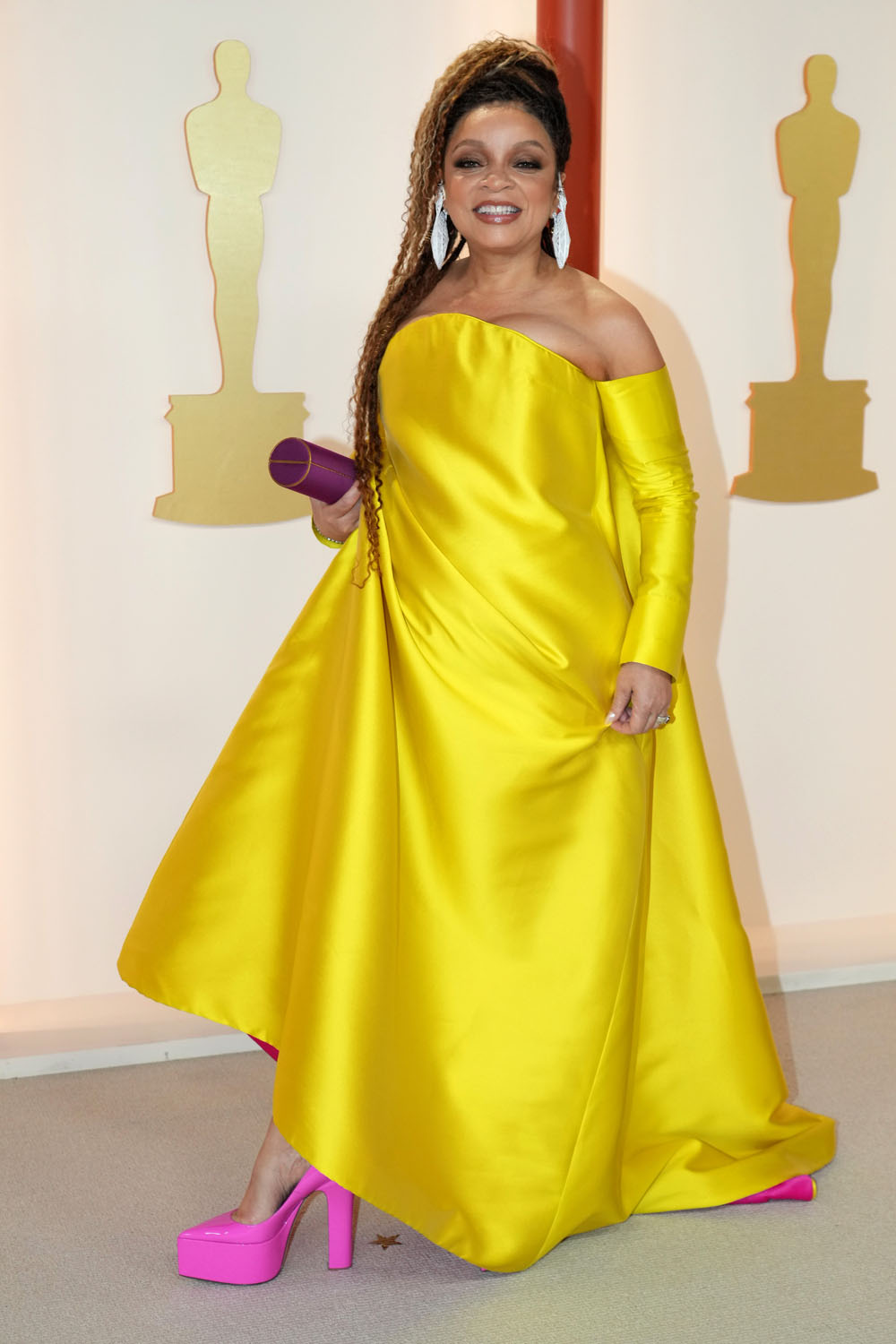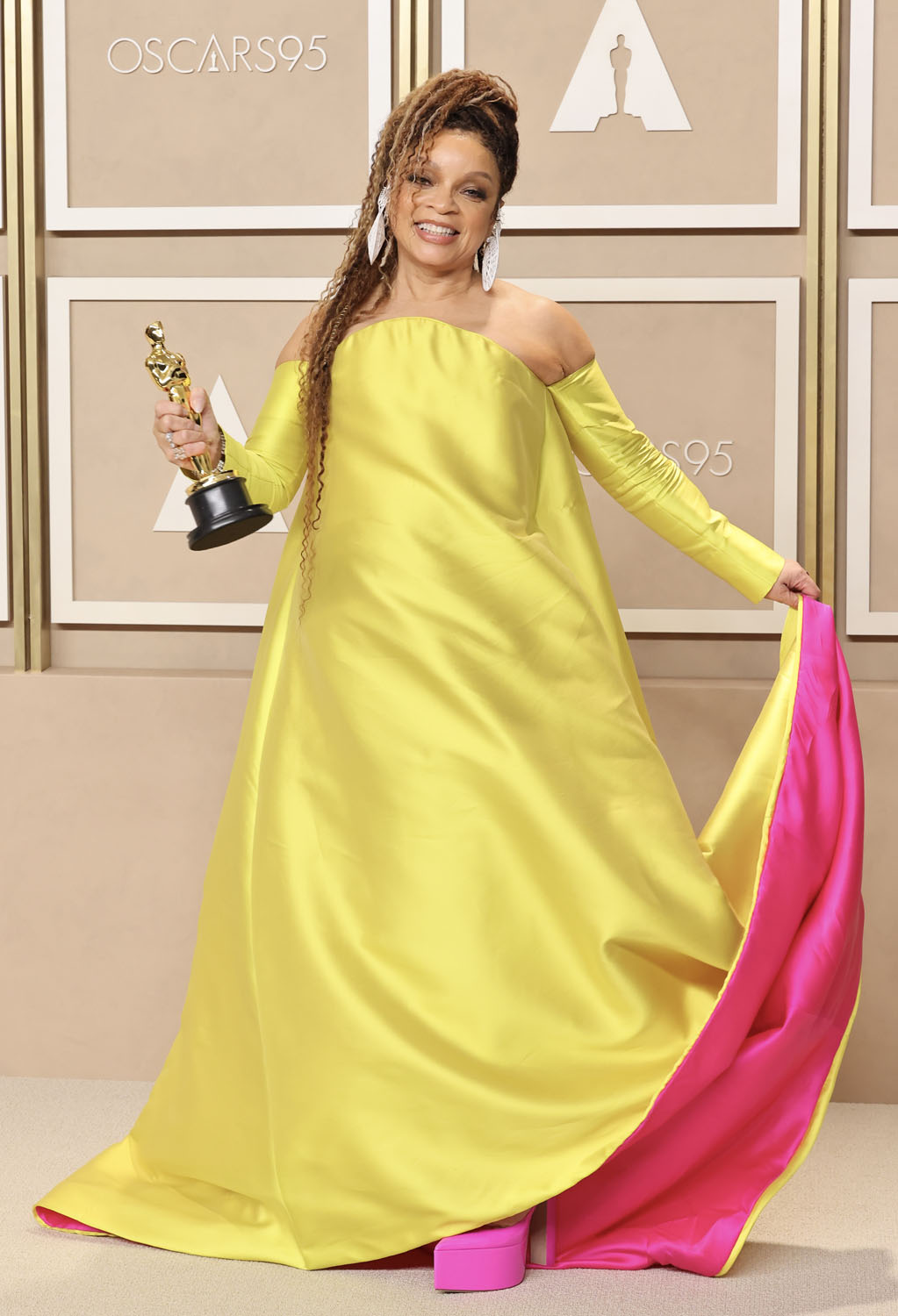 Her outfit was so simple, but incredible – that joyous, succulent yellow in her dress and sleeves (which I far preferred to all the elbow-length gloves, you know everyone was ripping those off when they had to text!) and earrings, evocative of the white mourning outfits in the beginning of Wakanda Forever which was, of course, on purpose, as she let us know.