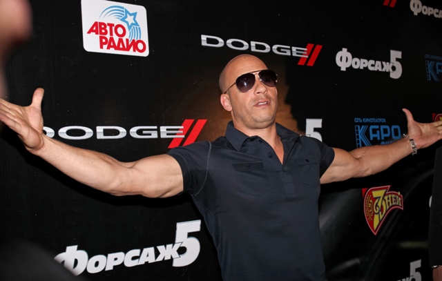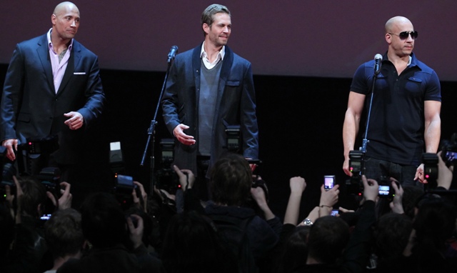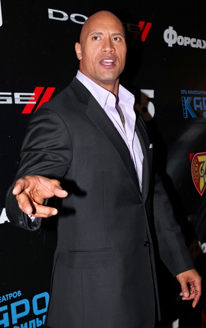 The Rock Dwayne Johnson has joined the Fast & Furious franchise. Here he is with Vin Diesel who I call Shrek because, obviously, and Paul Walker today in Moscow promoting the upcoming Fast Five which will make a stupid amount of money and that’ll be an excuse to make another one and…what else does Paul Walker do?