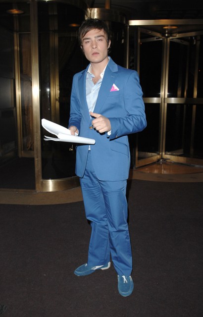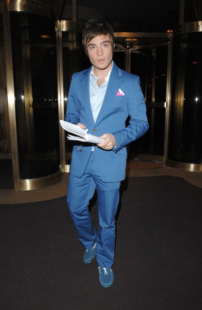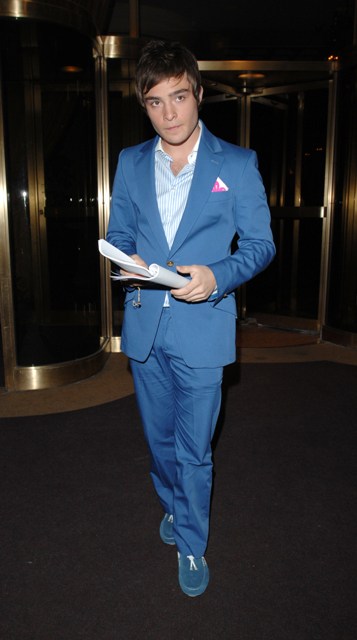 See what I mean about Ed Westwick being a Shame F&ck? Here he is last week on the set of Gossip Girl in a blue suit – the cheese face, the long torso and the too short legs, the horribly unattractive gait, and the worst… his turned-out feet. I can’t stand it.