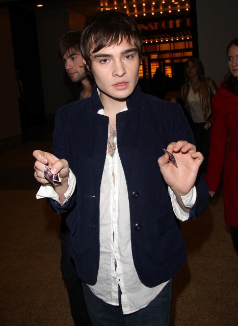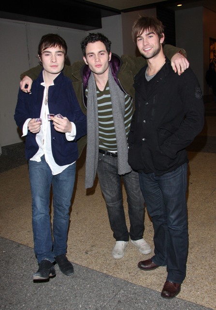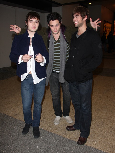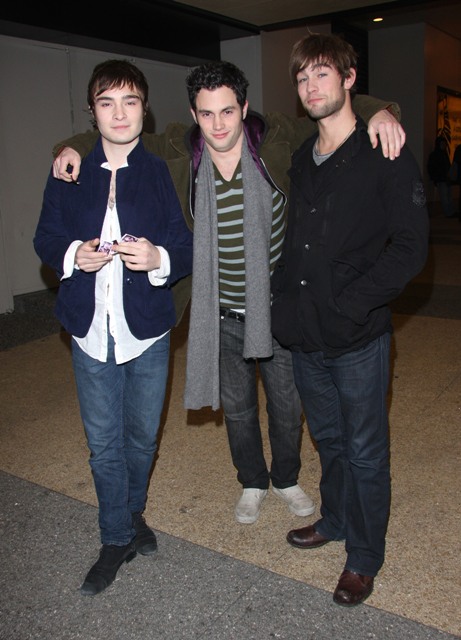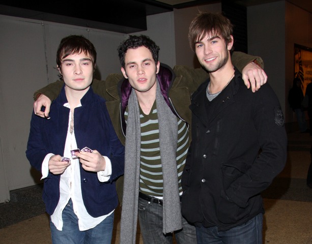 Ed Westwick (Chuck), Penn Badgley, and Chace Crawford stopped by TRL the other day to promote the show. As you can see, Ed’s pants have issues. First of all, they sit too high. And the wash is ass. And few boys can pull off the ankle length - he’s not one of them. And Ed, like Chace, has a small case of gay face. Gay face is great for the gays, but not for the girls.