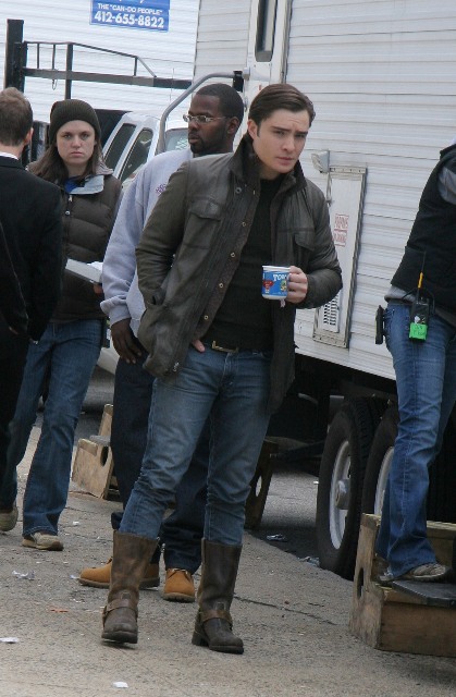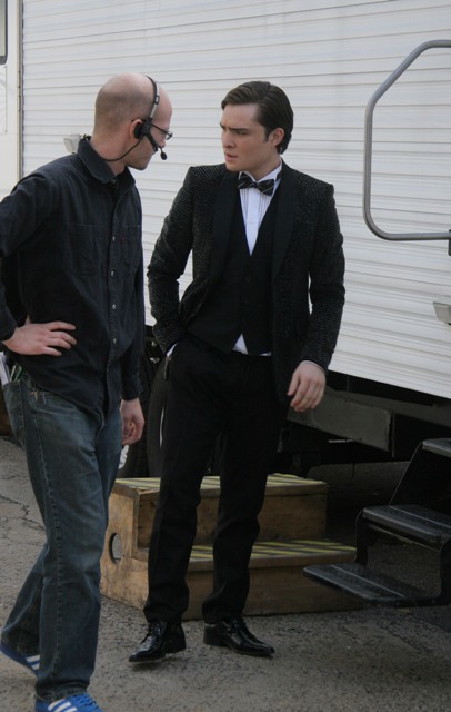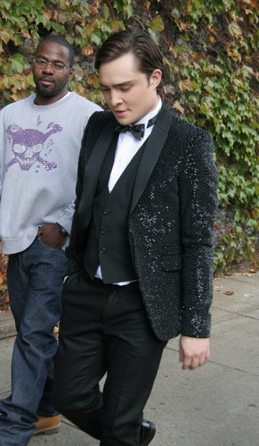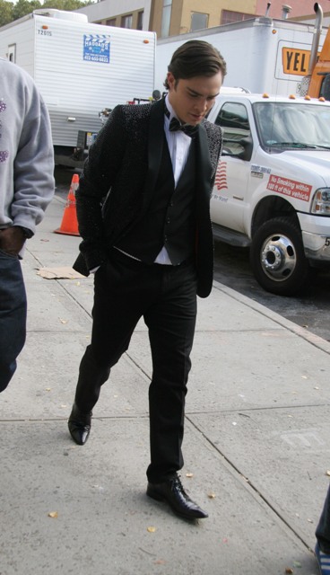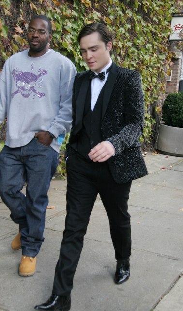 In the meantime, will just have to enjoy (shamefully) these new photos of Ed Westwick on set wearing a sequined tuxedo jacket which is actually less ridiculous than Ed Westwick in jeans tucked into his boots.