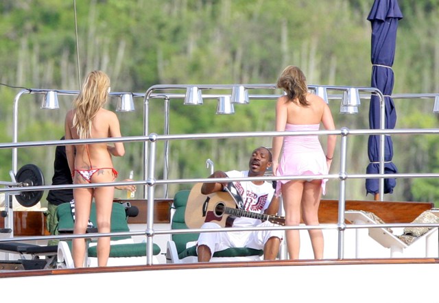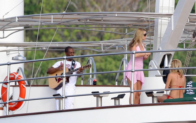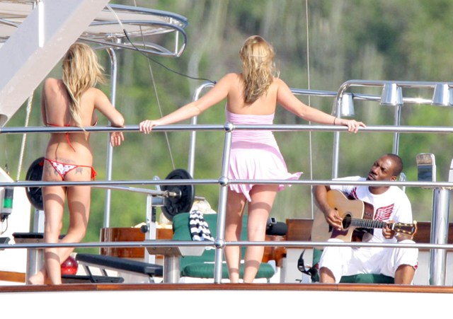 Here he is on a yacht, accompanied by a couple of generic blonde lady accessories, and his usual circle of sycophants, and his guitar too, the lyrical poet at sea. Random. And bizarre.