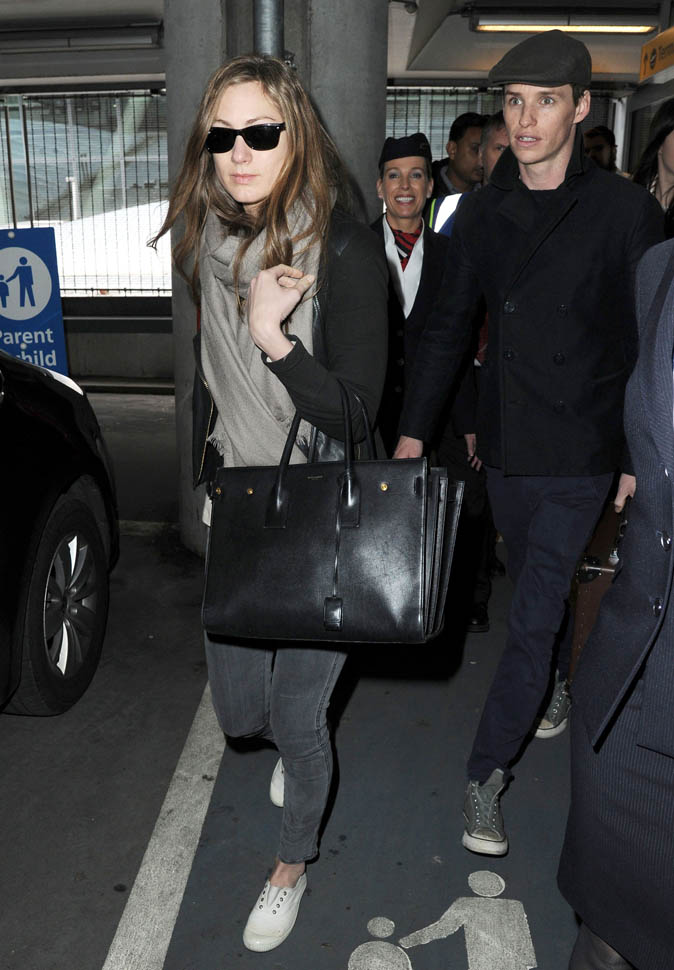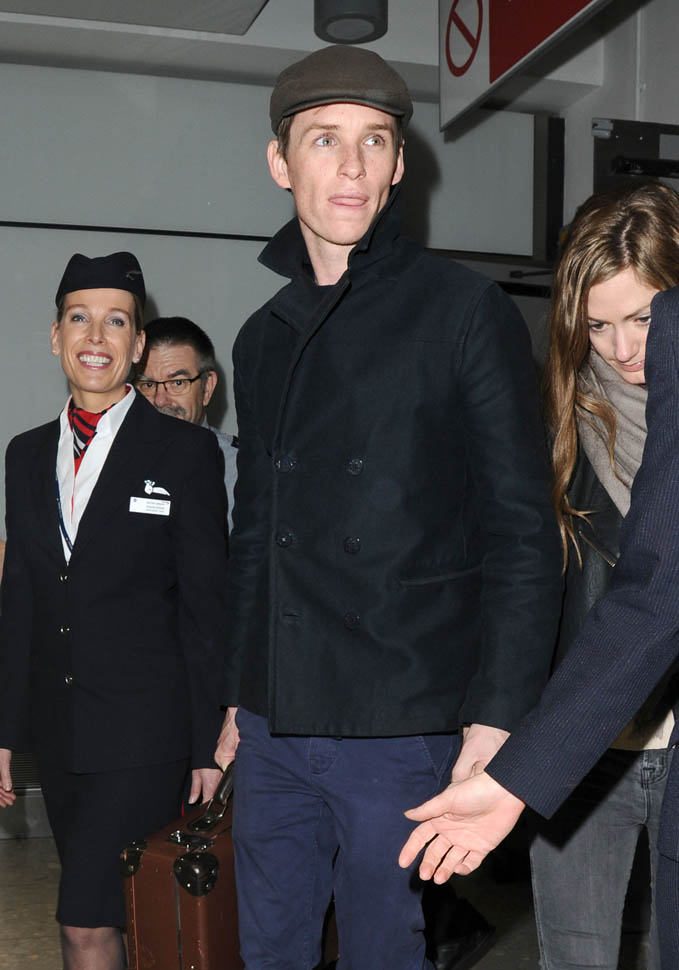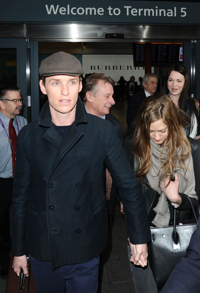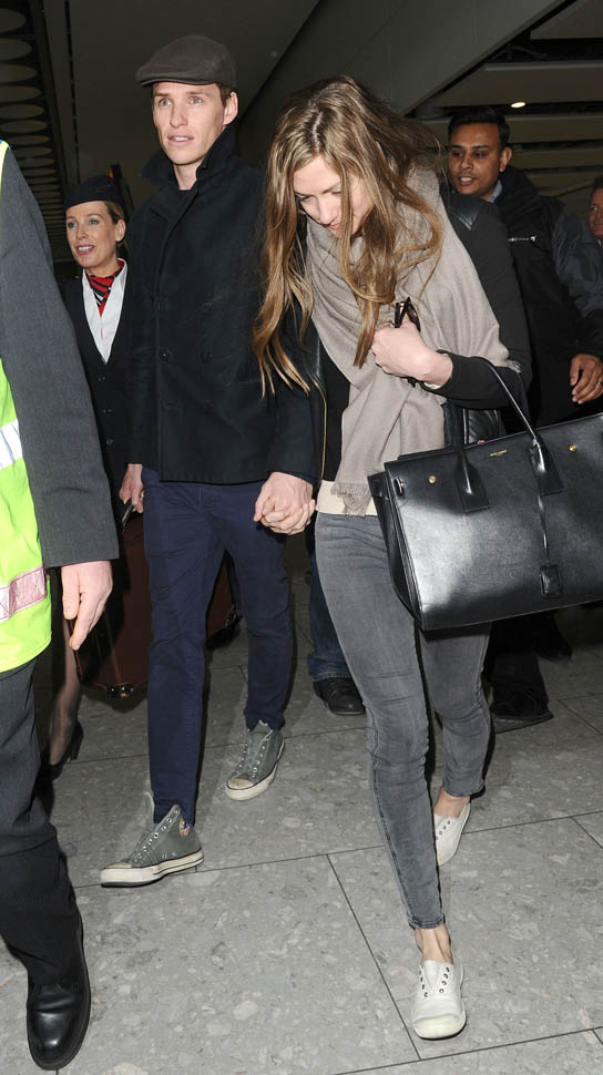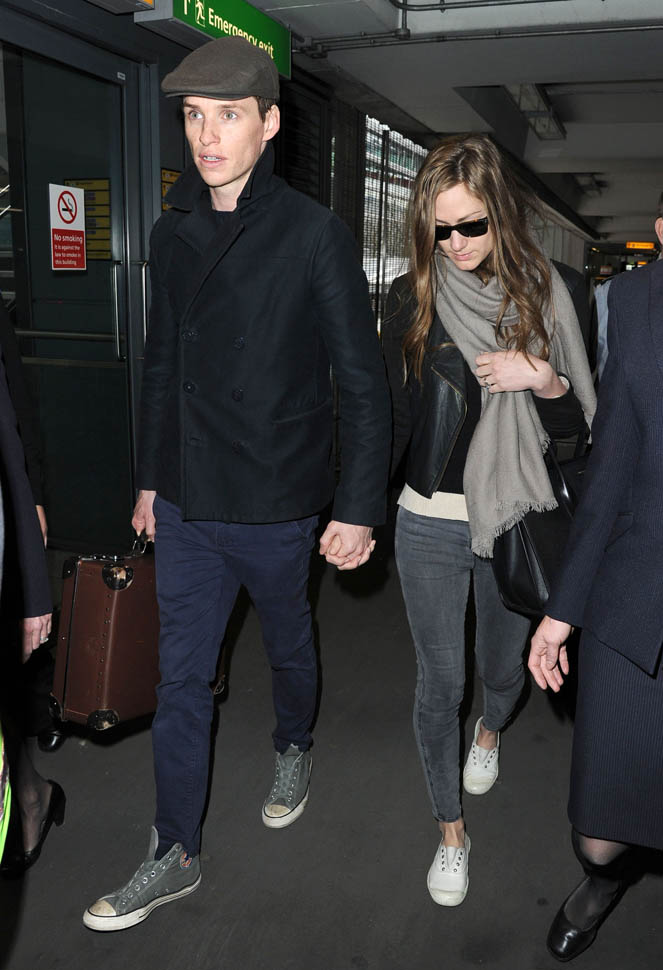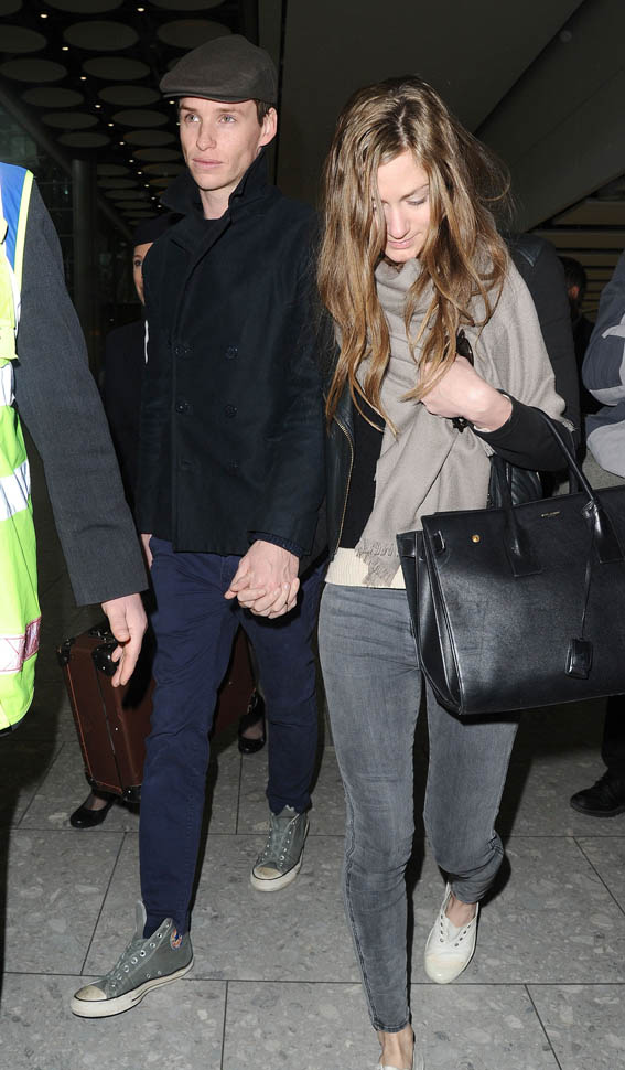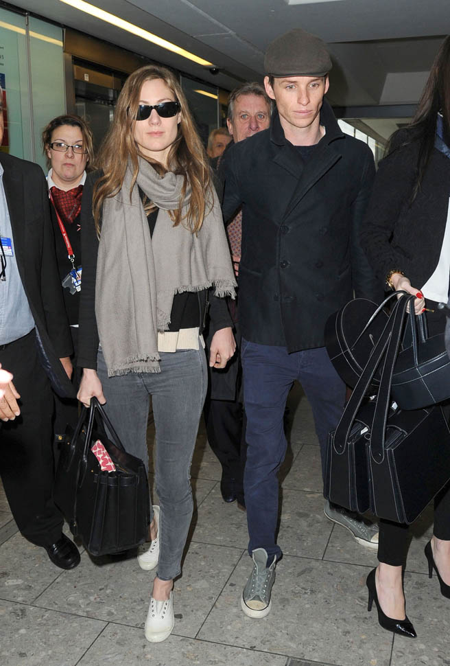 Eddie Redmayne and Hannah Bagshawe were seen at LAX yesterday and then landing at Heathrow after the Oscars and the parties. There was a story after the Globes about how he had to explain to airport security what the trophy was in his carry-on. He likely didn’t have the same problem with his Oscar.