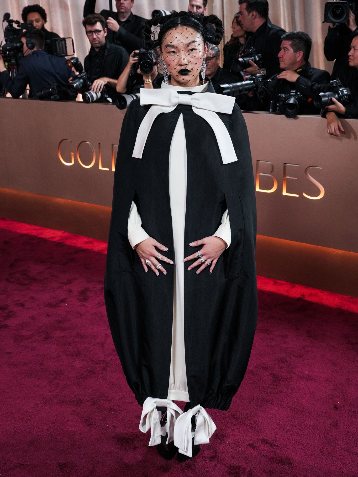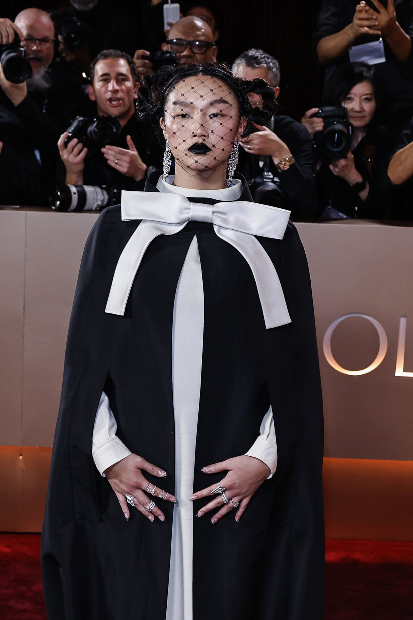 My favourite look, though, out of all the Huntr/x girls, is Audrey Nuna’s, OMGGGGG. This is Thom Browne and this is also SO Audrey. She has never, in all these months, at all these appearances, ever dialed down her taste, succumbed to an outfit that isn’t on her frequency just to play it safe. And it’s not just the clothing but also the hair, the makeup, that dark lip – this, for me, is one for the books. One of the most iconic Golden Globe red carpet debuts of all time.