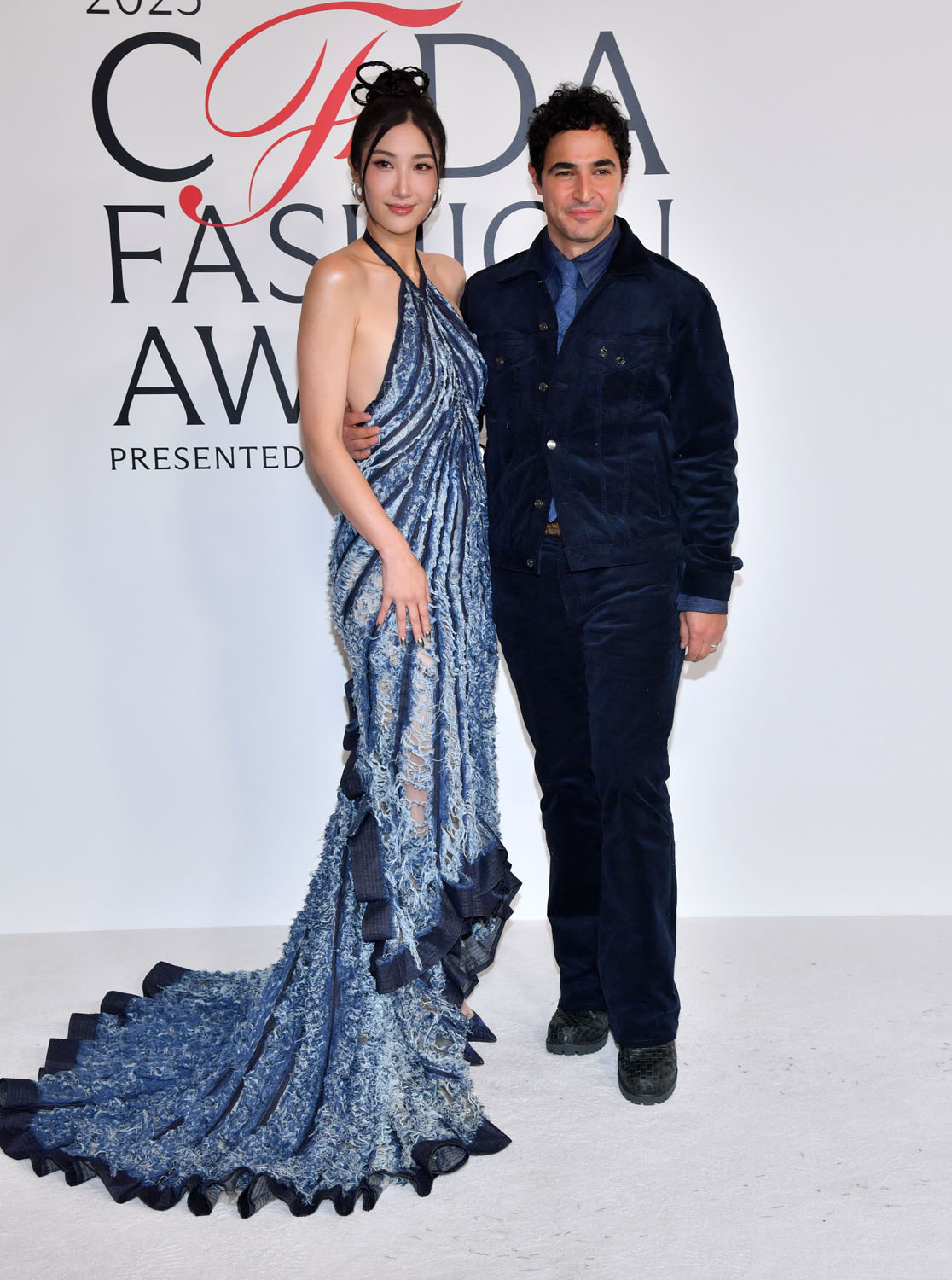 EJAE was at the CFDAs with Zac Posen in custom Gap Studio, a halter dress that looks like it’s made out of shredded denim, with her hair done in traditional East Asian looping braids. She looks SO good.