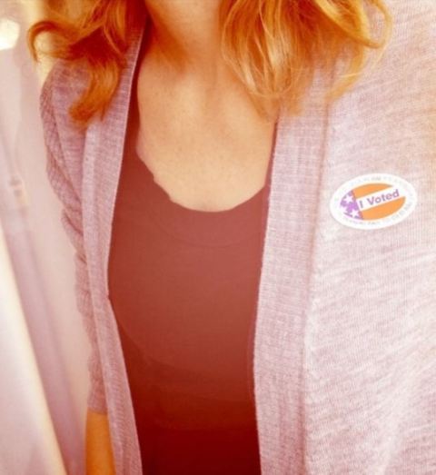 By this logic, Elizabeth Banks is the anti-famewhore, as this charming pic of her boobs and her voting sticker does not include her face. I mean, you can only get there through her WhoSay so it’s not like you can’t guess, but Liz, man, your smiling face would be a motivator, don’t you think?
