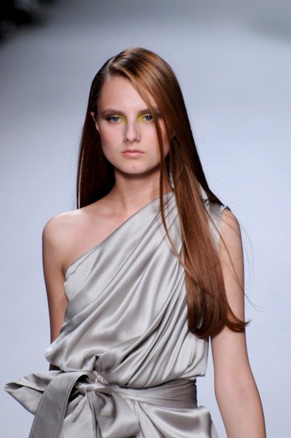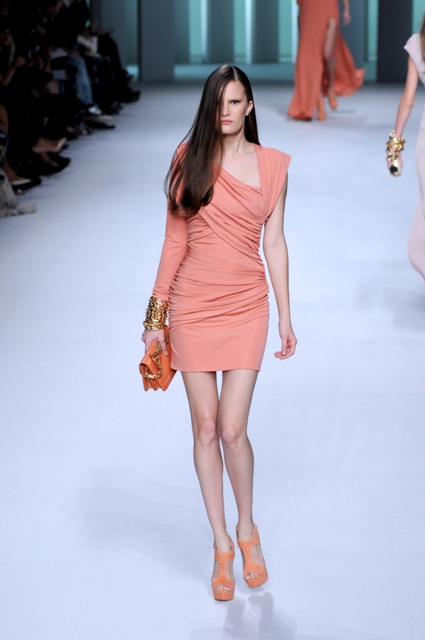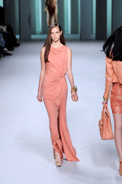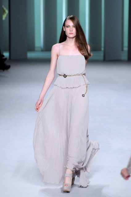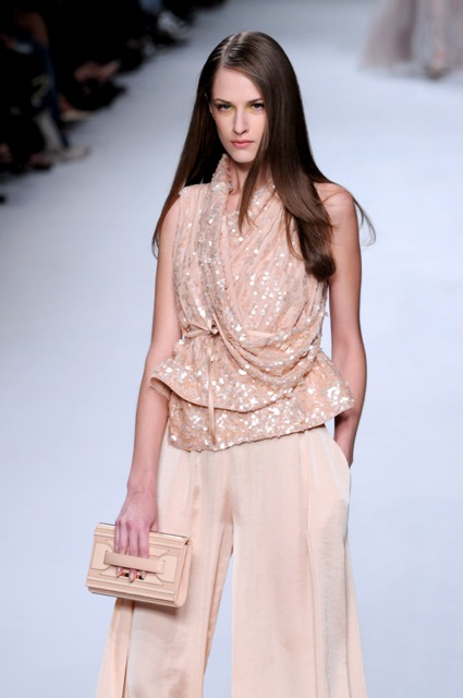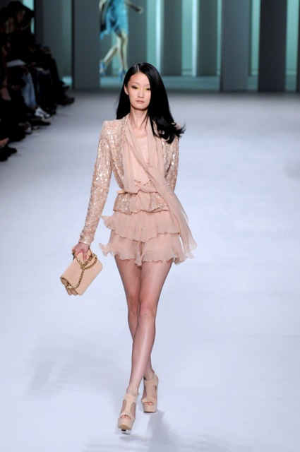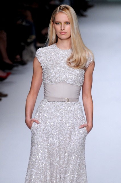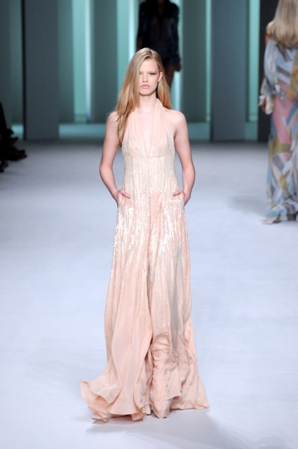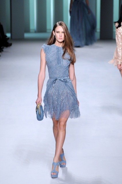 Saab showed today at Paris Fashion Week. Meh. I don’t usually get jizzy over his aesthetic. Some of these dresses are pure Desperate Housewives. That short blue frayed number is a sure bet for Natalie Portman somewhere, and maybe the long blue deep v sequin on Diane Lane, but otherwise this week there have been many more exciting offerings.