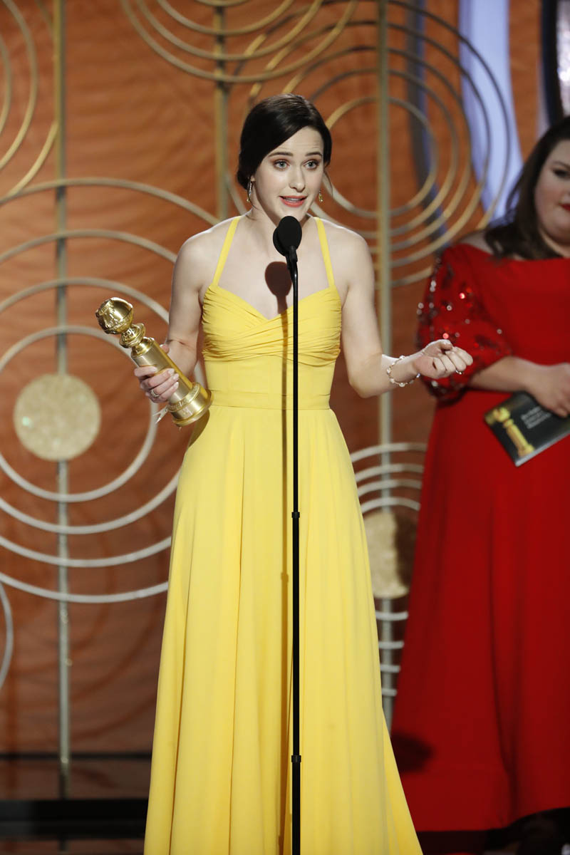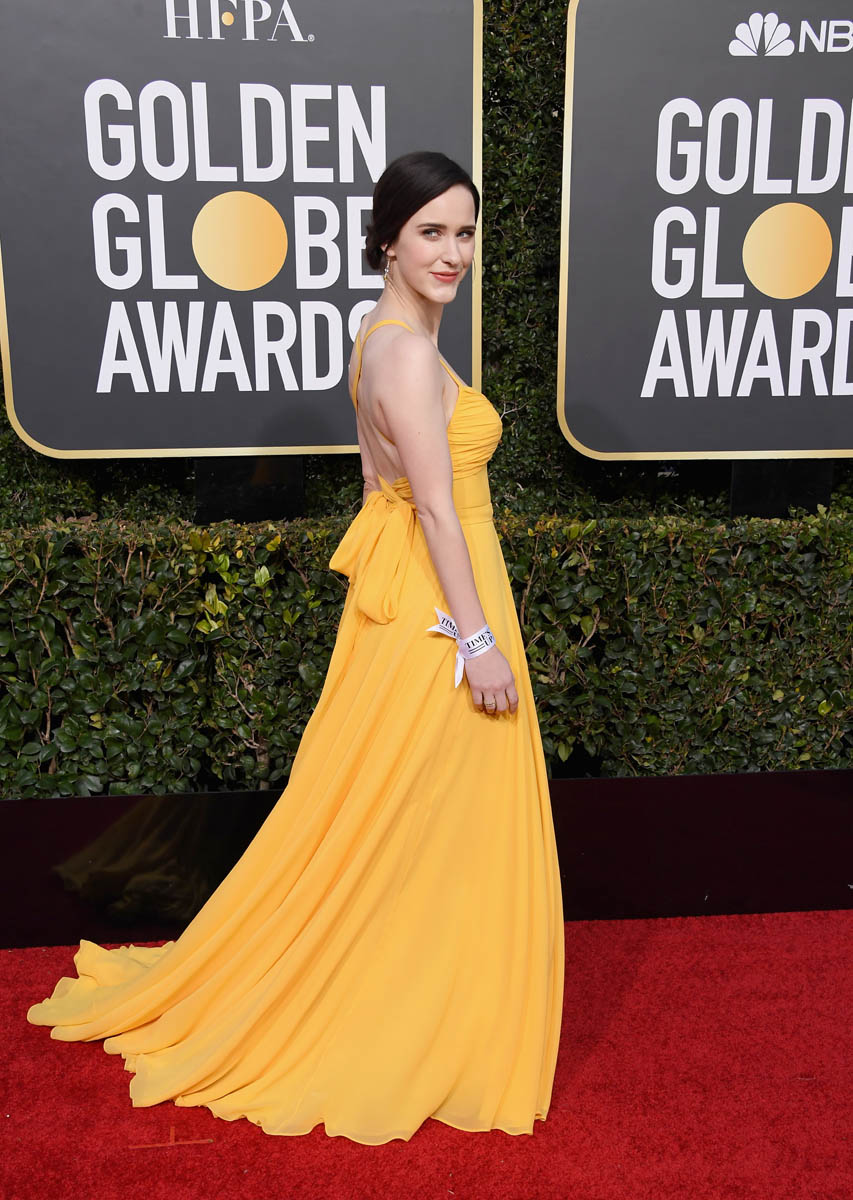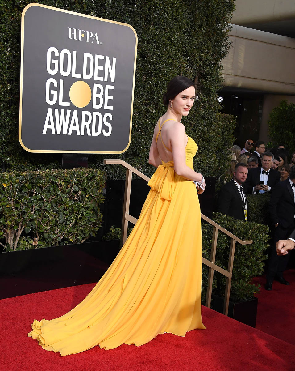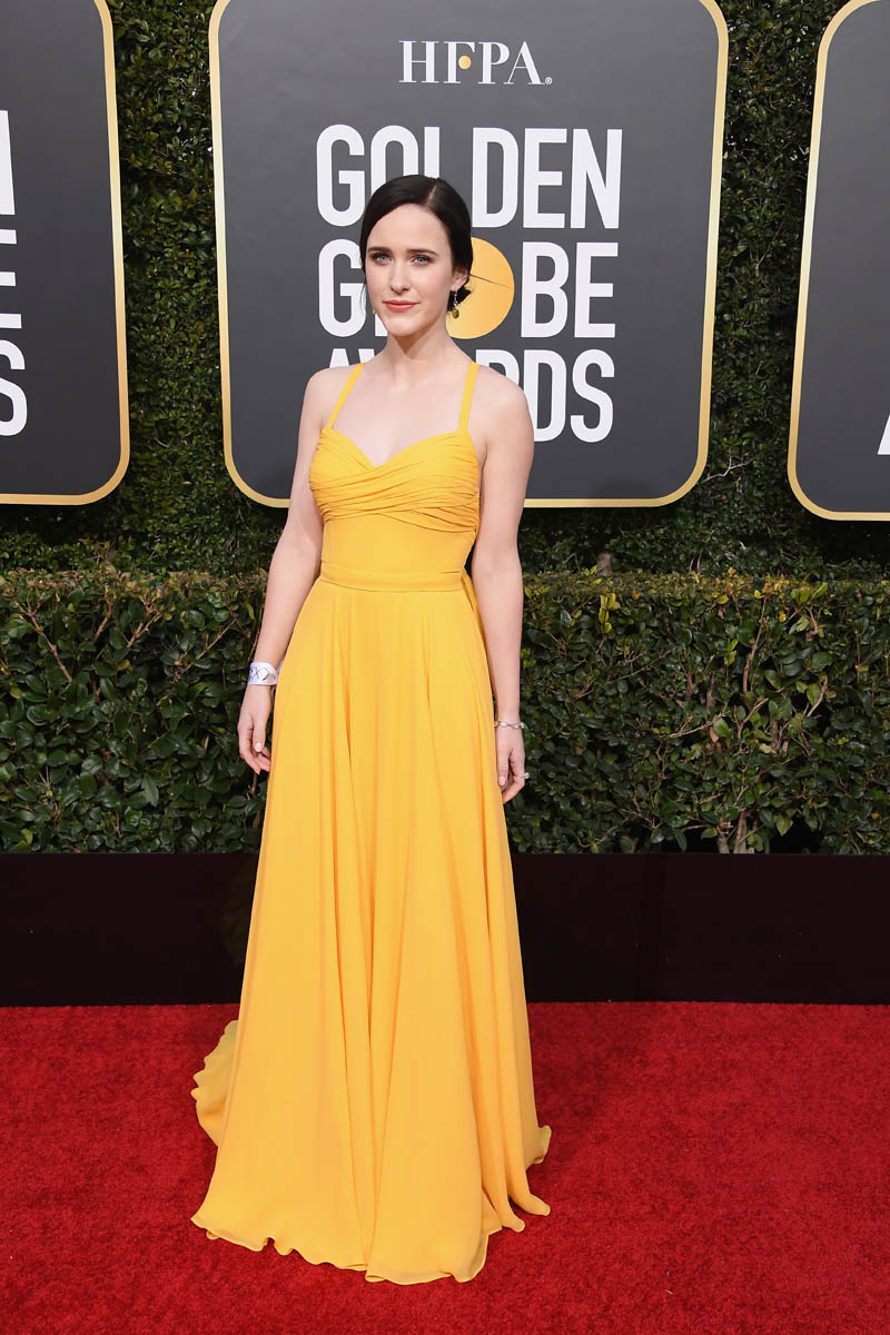 Brosnahan, on the other hand, did choose a ‘what if you win’ dress, and unlike most people I don’t hate the yellow (it’s Prada), but if you’re gonna do a big yellow dress you need the hair and jewels to balance it out. Maybe her ‘throw on a dress and run out the door’ vibe is contributing to my feeling that she’s not 100% sure the HFPA made the right choice. Just me?