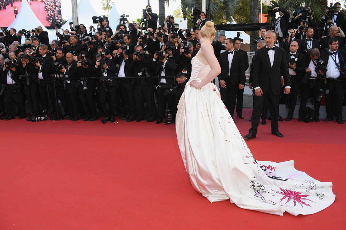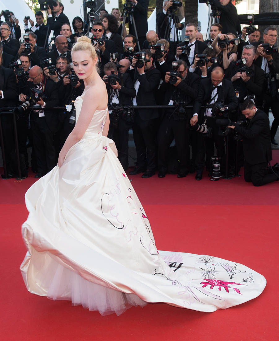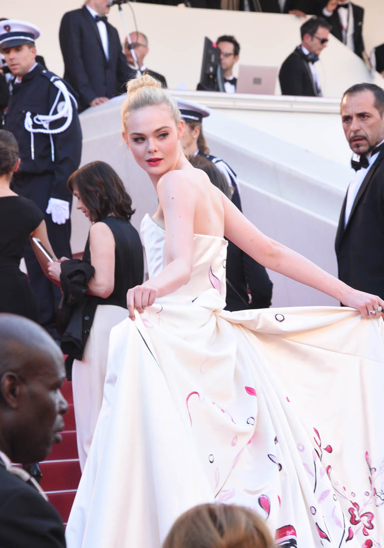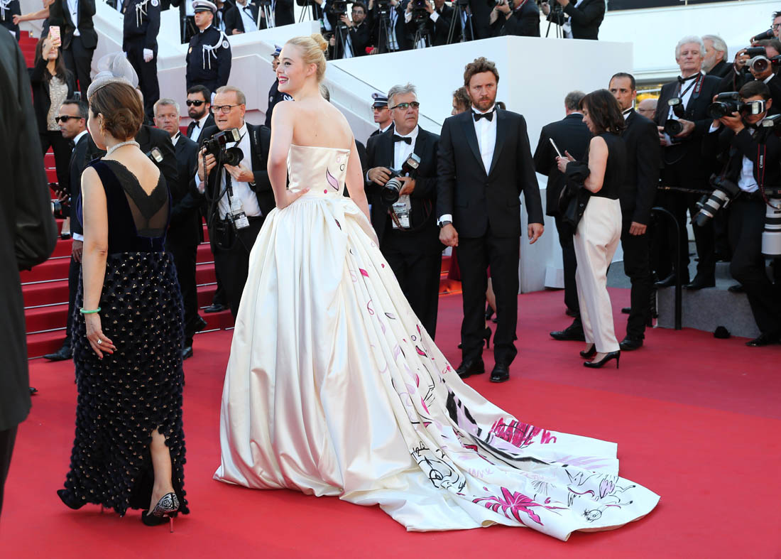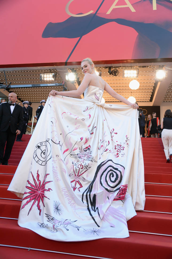 Anyway, here’s Elle Fanning at the opening night gala in Cannes and it’s perfect for Cannes. I am here for this princess dress. It’s custom Vivienne Westwood, made specifically for her, with a unicorn hand-painted on the back. VOGUE has more details about the design. I don’t want to see this at the MET Gala. But in Cannes? This is exactly what you do in Cannes.