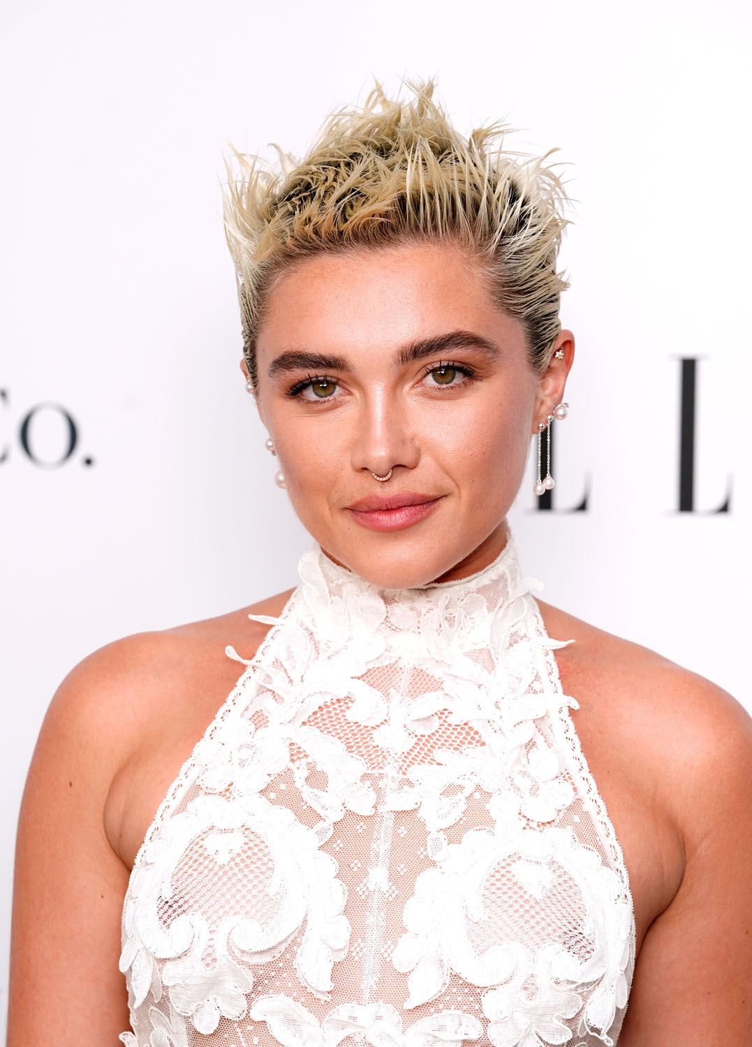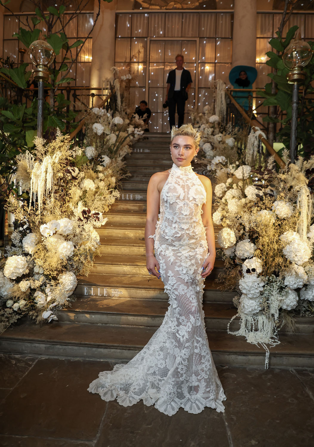 Florence Push covers the October issue of ELLE UK as the British Icon and she attended the ELLE Style Awards last night in London in a white lace Alexander McQueen gown that fits her beautifully but what really makes the look is her hair – short, spiky, badass.