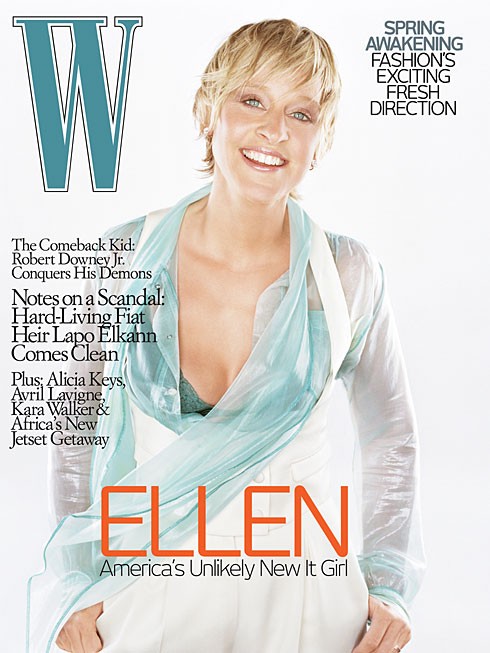 Ellen in W Magazine is trippin’ me out. Don’t get me wrong…it’s a lovely, lovely shoot. And she looks lovely, lovely in it. I’m happy they didn’t make her wear a dress, she says she’s not comfortable in dresses, but she does look pretty chill in those sexpot heels Check it out – Ellen lounging back in a chair, it’s a hot photo, it’s a hot pose, sensual as all hell in her f*ck me stilettos, glam and edgy and dark and loaded down with black eyeliner and not much else - fantastic images, all of them….though truth be told I like Ellen better just Ellen. In person she’s just as likeable as she is on tv – maybe even more so. Smaller than you’d expect and funnier than you’d expect and as a result sexier than you’d expect because she’s so damn funny. Oozes confidence but not conceit, humble too, and although she was the biggest star at the venue, she was the least temperamental of the lot…funny that, non? Which is why, really, when you think about it, Ellen doesn’t need all this adornment. Seriously, I’m not tryin’ to shove Oprah up your ass here…she’s really more gorgeous without it. Can’t wait to see her on Oscar night. Ellen is going to kill on Oscar night.