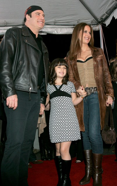 Pimping kids for publicity and profit – the new sales strategy in Hollywood and it looks like the Travoltas are the latest to hop on the bandwagon. Here they are from a couple of nights ago at the premiere of Wild Hogs – I cannot for the life of me understand why the brilliant William H Macy accepted this script…I mean is he poor??? Sorry I digress. Check out John and Kelly and Ella Bleu (great name – love the name) trying their bestest to forget the masseur. Something tells me someone was given a stern talking-to recently, an order to get his manly man back in a straight line. Which is why the leather and the motorcycle and the proof of hetero fertilization is now being trumpeted so conveniently. As for that infamous Oscar dress – you know which one, don’t you? The Animal? The Worst Animal? The eye-raping atrocity that was Kelly Preston on Sunday night? Many of you have emailed following the couple’s explanation that John had chosen that dress for her a while ago and they waited together for the perfect opportunity to debut it, and the sheer hideousness of it has thrown some for a loop…because how could any self respecting ‘Mo make that kind of style decision??? Easy. This is what happens to a Repressed Gay. A Gay who has been forced to put away his flash, to hide his feather boa underneath a bushel. And without proper nurturing, without the benefit and support of other members in the Community, without enough exposure to the Gay Way, this alleged Gay has clearly lost his sparkle. Sigh. Sadness. Tragic. Source