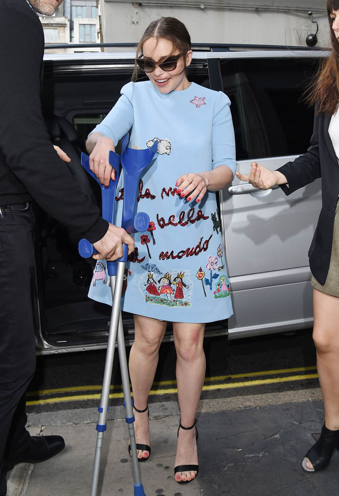 Emilia Clarke was on crutches today arriving for an interview in London. Don’t care about the crutches because OMG this dress!