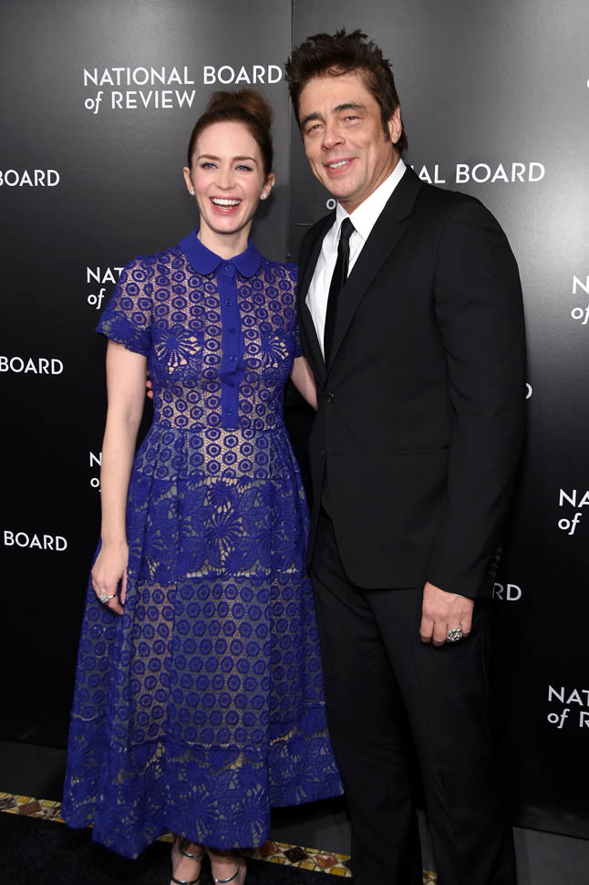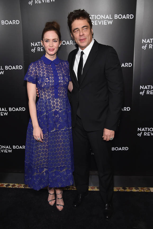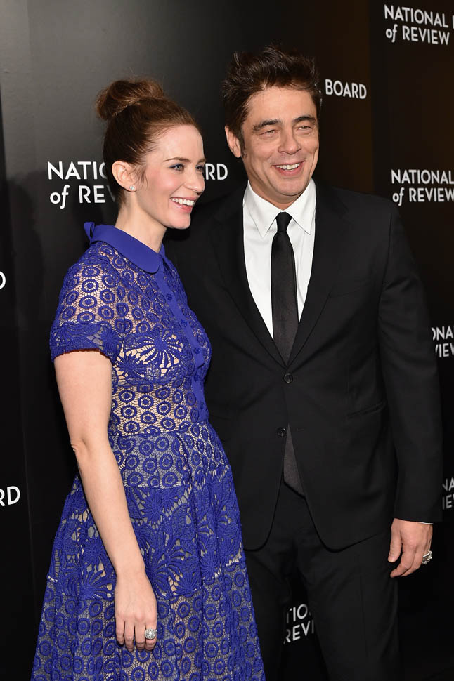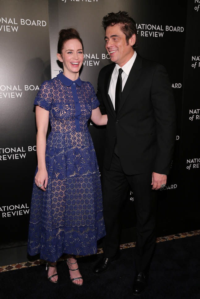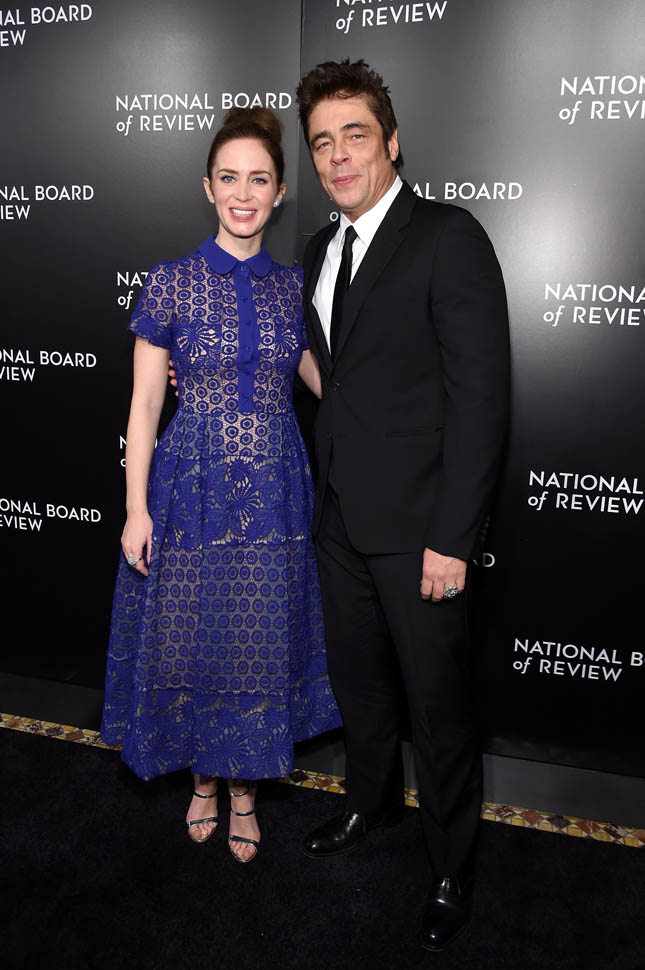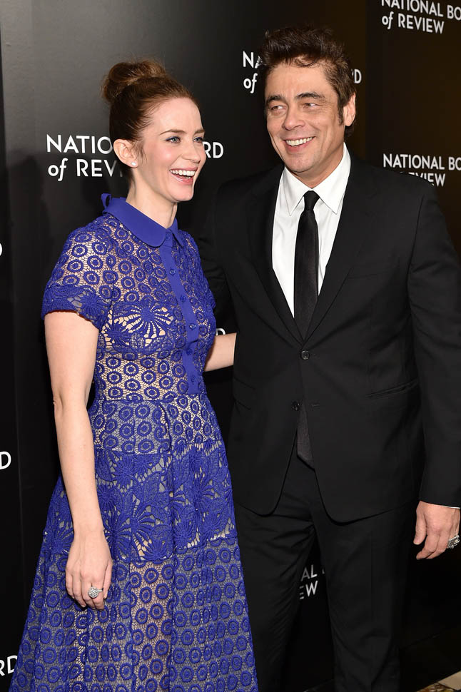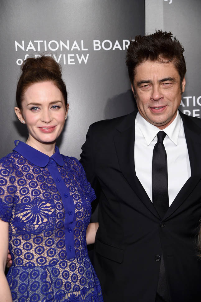 Last night Emily Blunt and Benicio Del Toro were at the National Board of Review to support Sicario, who recognized it as a Top Film and also gave it a Spotlight Award for “outstanding collaborative vision”, which I take to mean “you guys made that mediocre script seem kind of special”. (Also worth noting that NBR gave Best Actor to Matt Damon, who is working behind the scenes for The Martian. I will DIE if he sh*ts in Leo D’s Cornflakes on Oscar night.) Blunt and Del Toro are long odds for acting nominations, so they’re really campaigning for the film more than themselves. But their effort could be rewarded with several surprise-ish Oscar nominations. We’ll find out next week.