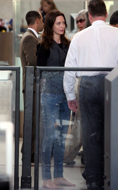 Emily Blunt at LAX yesterday out of Los Angeles and you can see the engagement ring presented to her by, of course, her fiancé (because it sounds so much better when someone else says that word) John Krasinski.