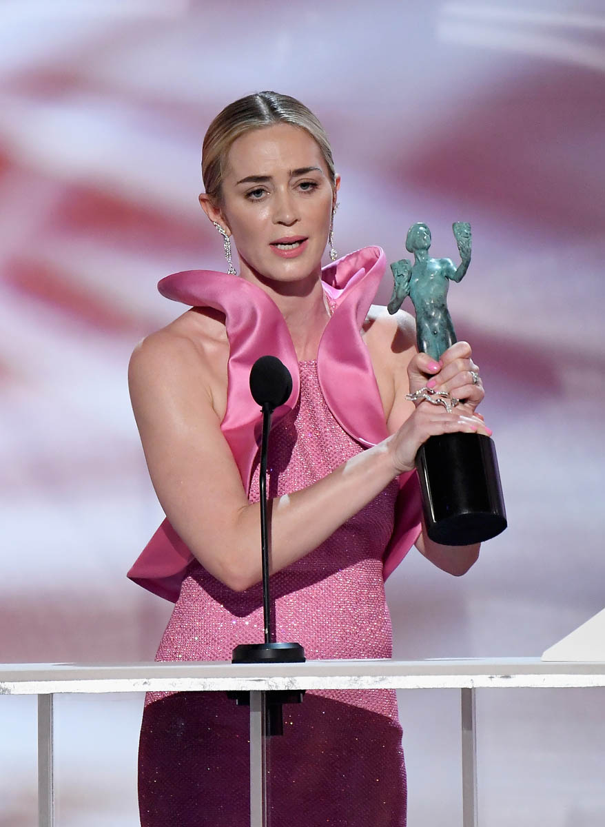 This was a surprise. Regina King was one of the biggest snubs when the Screen Actors Guild announced their nominations a few weeks ago and, since she was contending, most people thought it would go to Amy Adams. Instead it was Emily Blunt who ended up winning the SAG for Supporting Actress. She looked surprised too – especially since she was NOT nominated for an Oscar a few days ago.