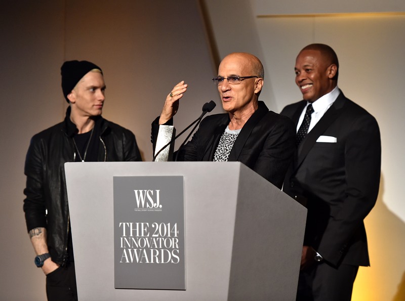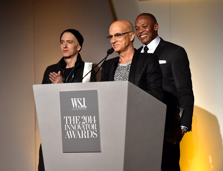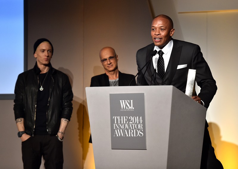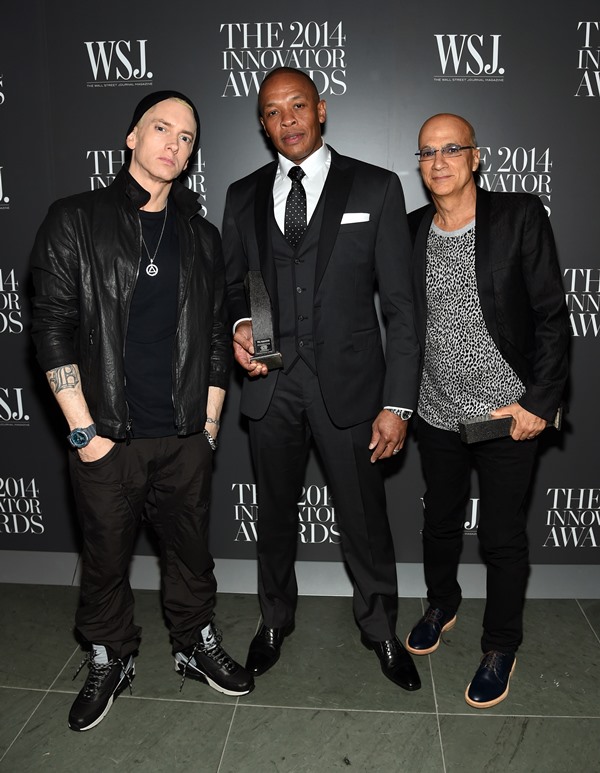 When was the last time you saw Eminem posing at a photo wall? It doesn’t happen. He’s basically a recluse. But last night Dr Dre and Jimmy Iovine were honoured at WSJ Magazine’s Innovator Awards. Out of respect for those two, Eminem made a rare appearance. He even smiled a little. And he spoke too: